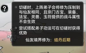 切磋的时候会将上阵弟子的战力有所削弱,和下图写的一样,搭配正确的功法会更利于胜利