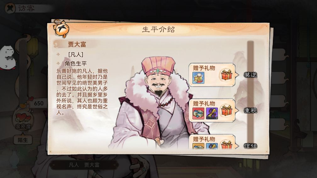 这些访客也会在地图上随机出现,也可以通过对话、切磋、赠送礼物提高亲密度
