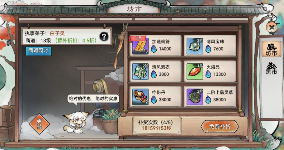在宗门等级10级的时候会解锁坊市,可以在里面购买一些物品,坊市每天可以免费补货五次,在补货第一次后,每隔两小时会补充一次机会。安排商道级别高的弟子可打折扣,推荐必买加速符和灵草灵木,还有法宝炼制用的材料,别的看自身财力酌情购买就好