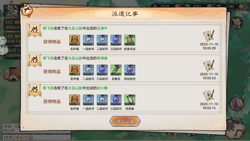 在地图里也会定时刷新妖怪,刷新的间隔是十分钟一次,并且地图里妖怪的最大数量是六只,如果到了最大数量的时候就不会再刷新。同时妖怪也是有品质的区别的,分为普通、精英、首领,品质不一样,奖励自然也就不一样。比如同样是元婴期的妖怪,云渊牛是普通的,青翎雀是精英的,精英的掉落会比普通的品质要高