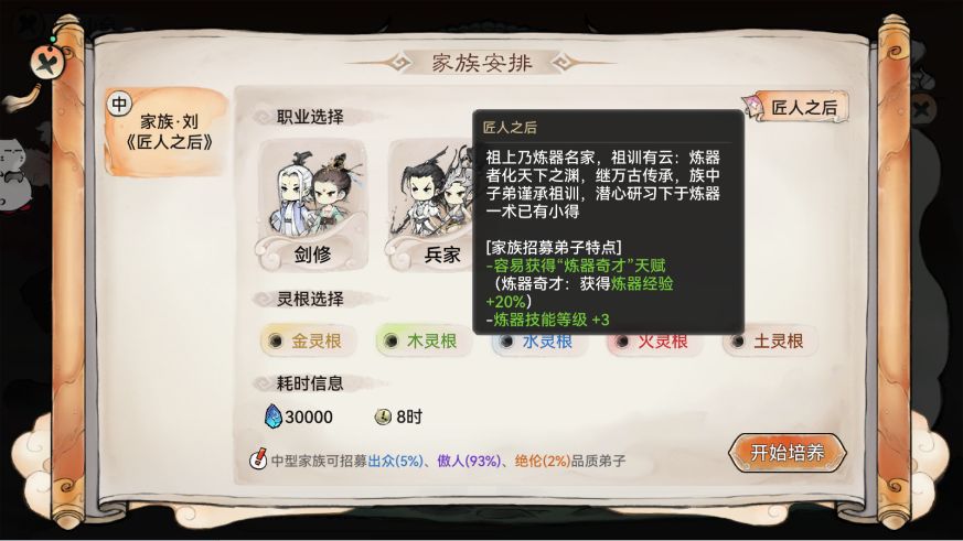 说完了妖怪和秘境,在主线进行到一定程度的时候,还会开放家族,家族目前最多可以入驻三个,入驻了之后就可以在招募时选择花费灵石招募家族弟子,可以自定义想要的灵根和职业,可以按自己的需求来进驻,比如缺少炼器奇才就可以进驻炼器的家族。