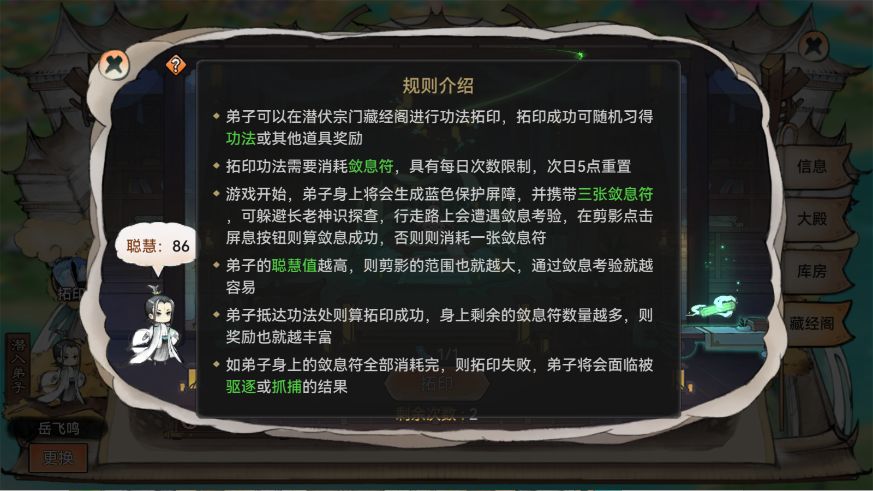 在主线进行到一定程度的时候会开启宗门,目前版本唯一的作用就是派遣弟子去拓印功法。拓印功法弟子的聪慧越高,拓印功法就越容易。