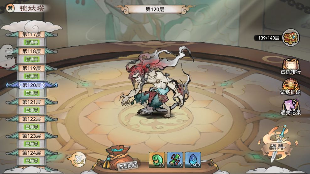 在右方有通关记录,可以看到别的祖师的通关阵容,还有弟子属性等等,打不过的时候可以作为参考看看。战斗并不消耗体力什么的,所以如果打不过的时候可以选择多打几次,或者更换一下阵容的位置,说不定就能打过了。
