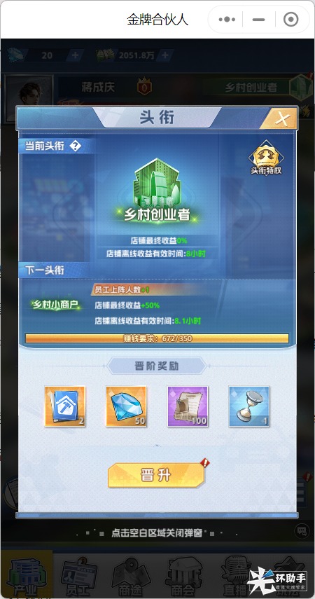 晋升头衔时,可提升店铺最终收益加成和店铺离线收益有效时长,还能解锁员工出战孔位数。