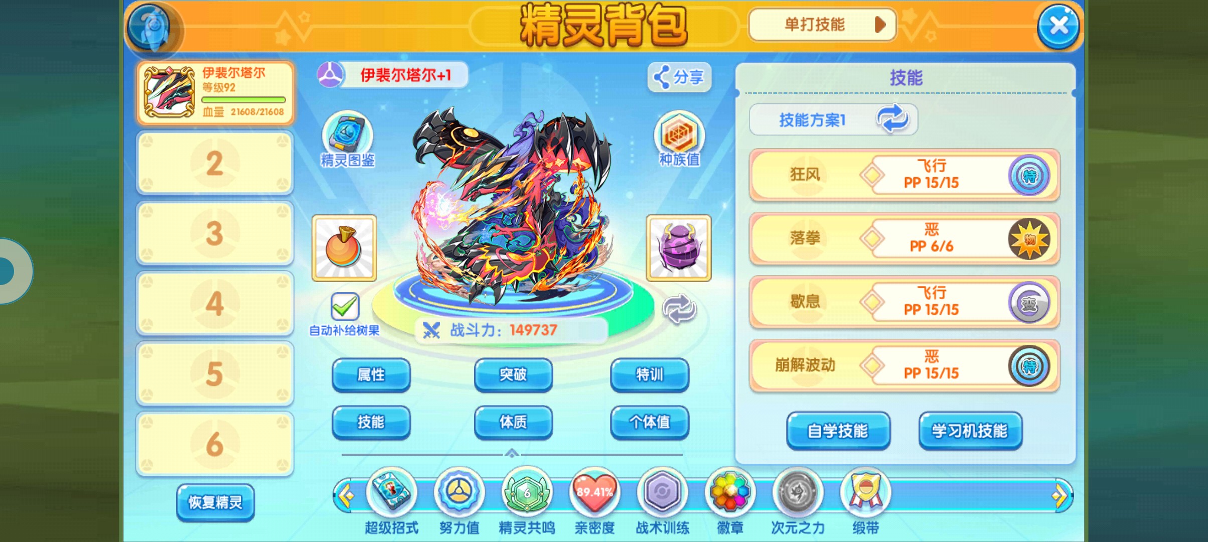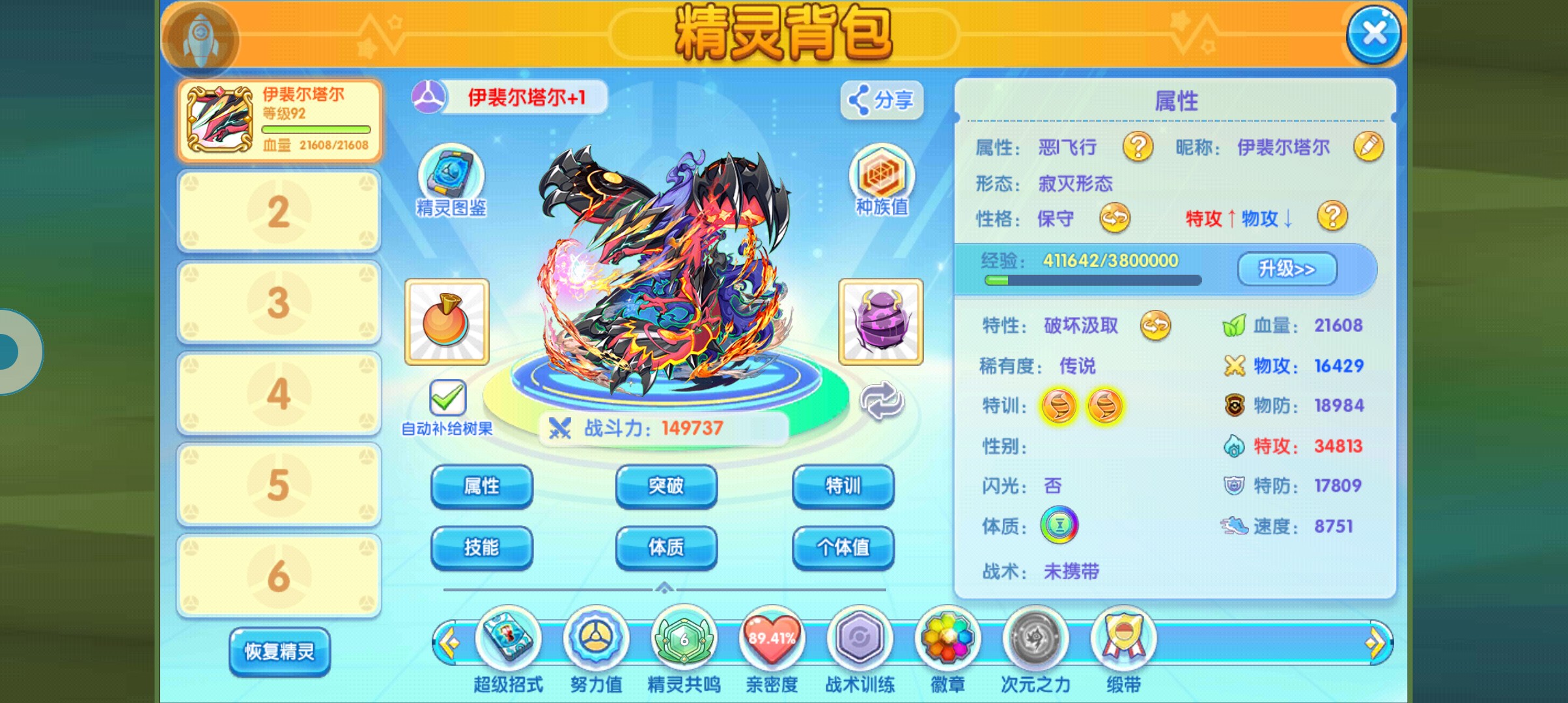 性格:保守,努力值:血量特攻,道具:湮灭之茧,特性:破坏汲取,超级招式:超级死亡之翼