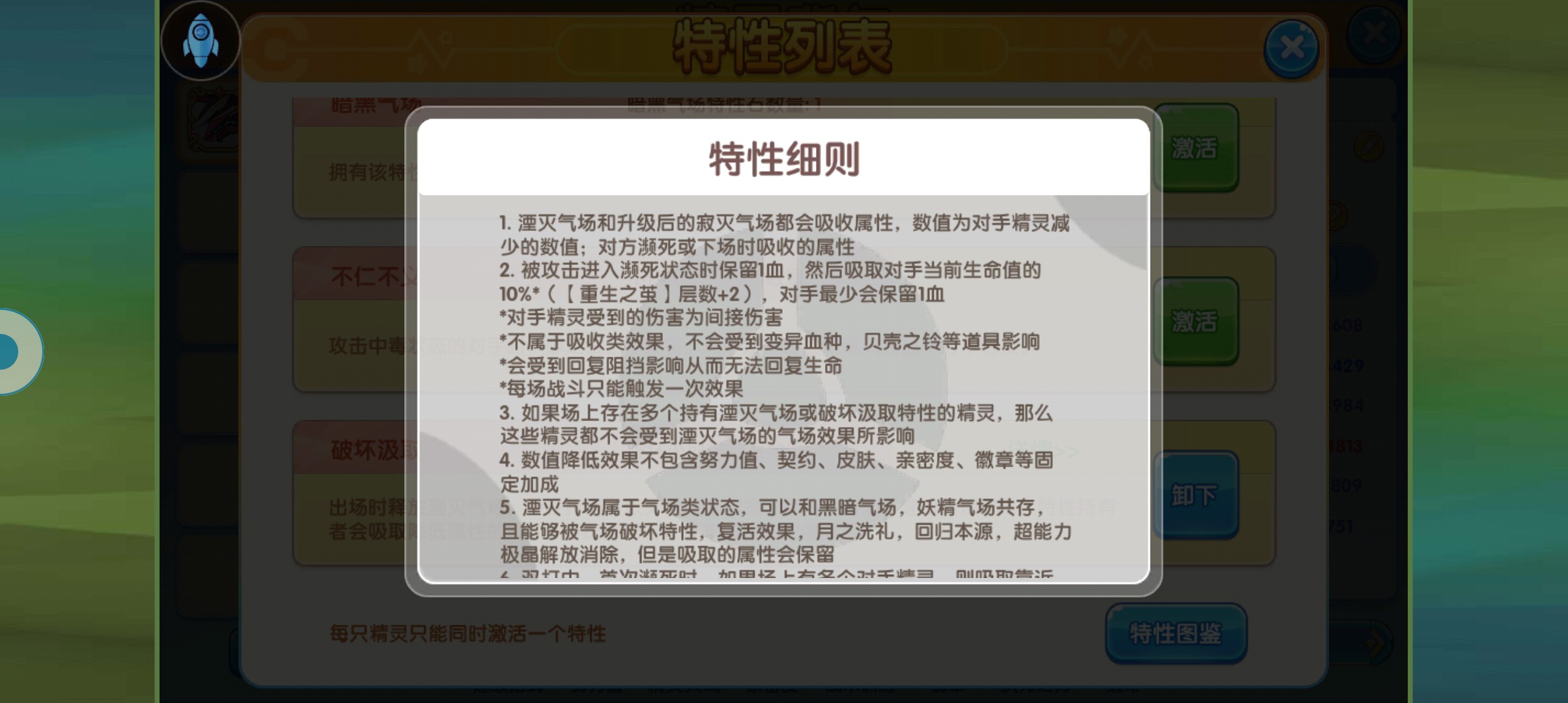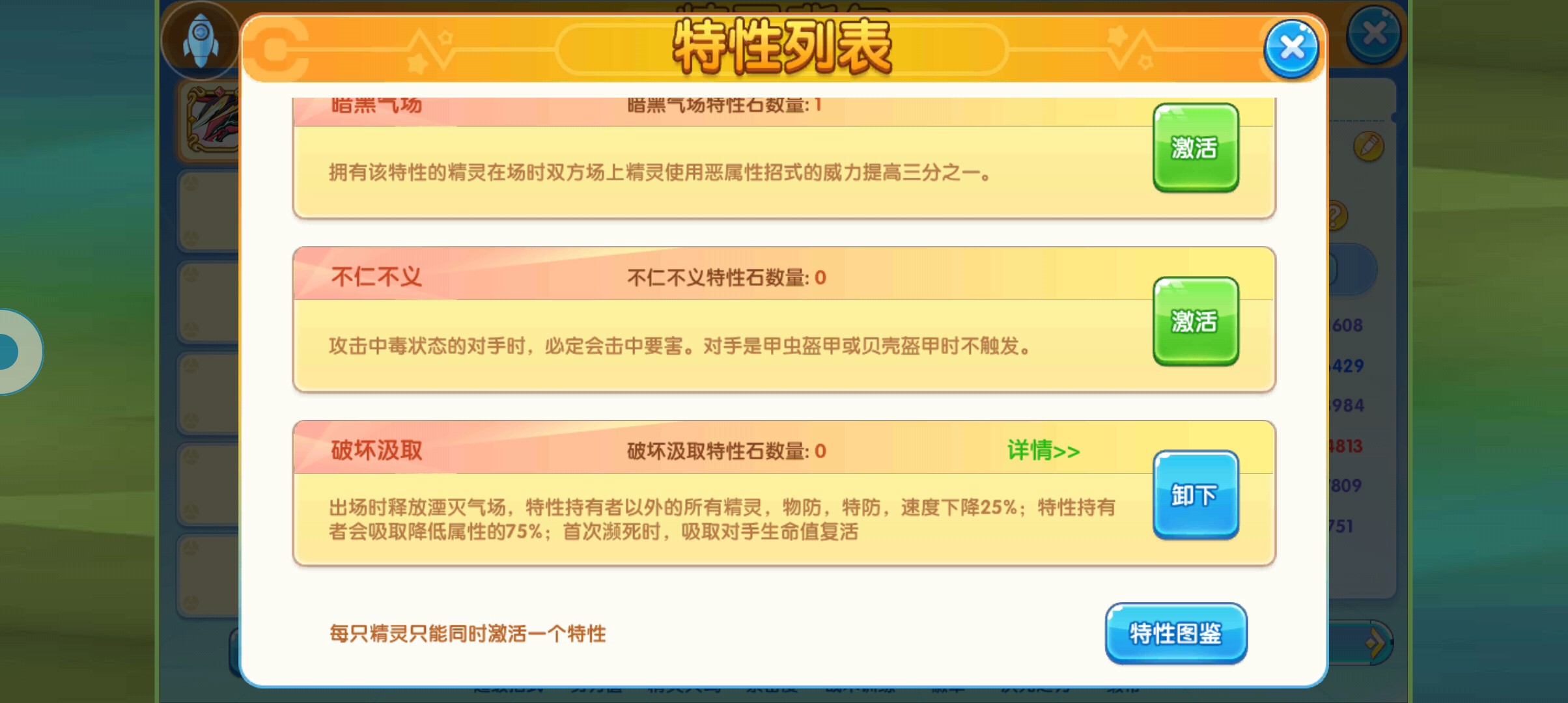 特性方面是可以吸收对方百分比的速度,双方然后对方下降百分之25,然后自己再从那百分之25当中吸取百分之75转化为自己的数值,说起来特别的绕口,先降低对方百分之25,然后再从降低当中的百分之75吸过来。那么,由于专属的效果,可以将降低能力从百分之25上升为百分之35