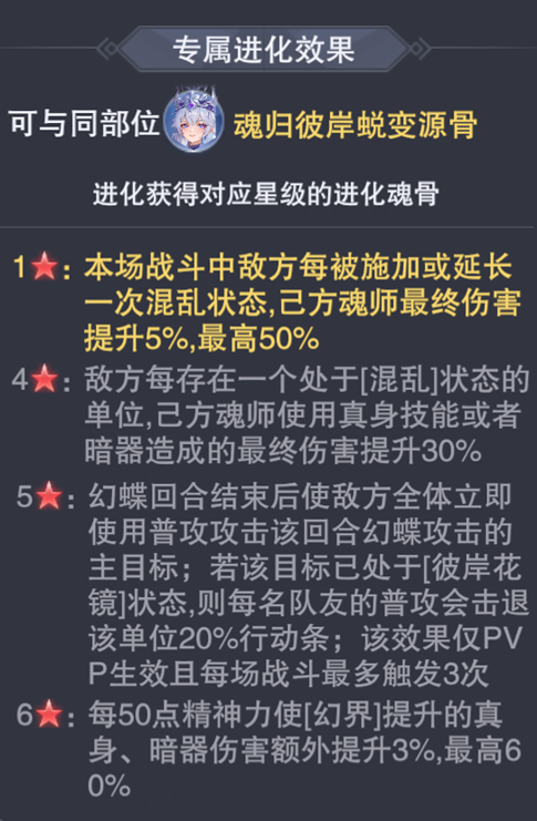 红6星:需要一定练度练度幻蝶才能最大化其增伤,1000点精神力才能对应最高60%真身/暗器伤害提升