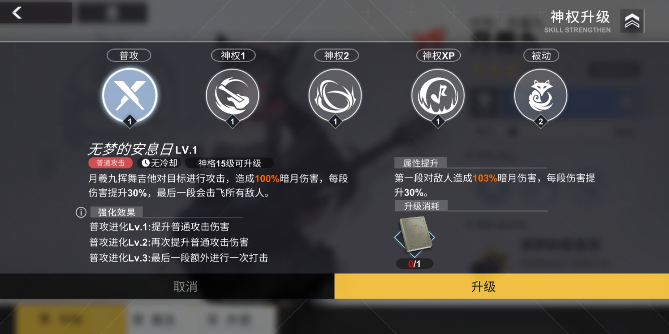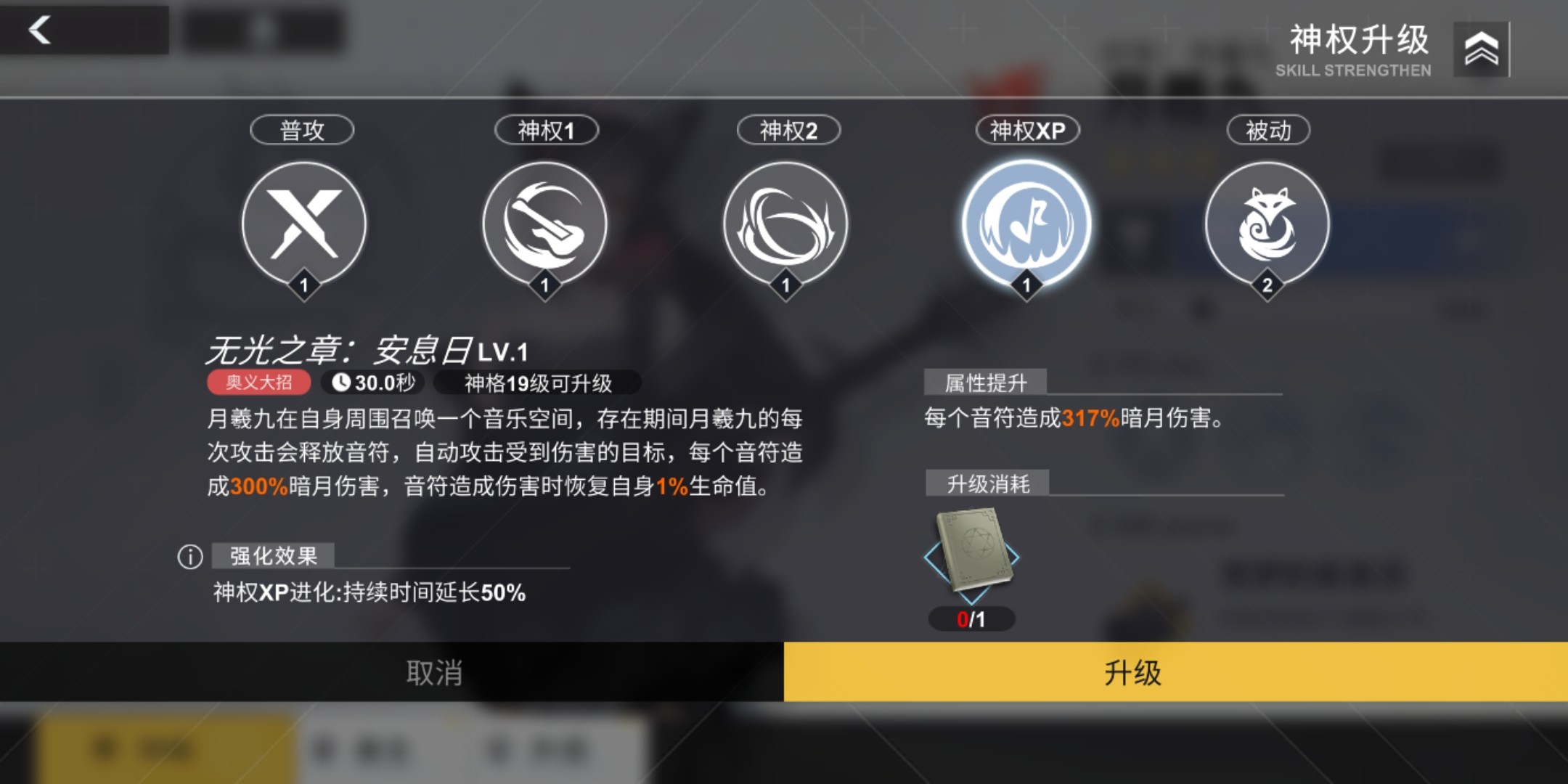 安息日月曦九在自身周围召唤一个音乐空间,存在期间月曦九的每次攻击会释放音符,自动攻击收到伤害的目标每个音符造成300+%的暗月伤害并回复1%的生命值神权