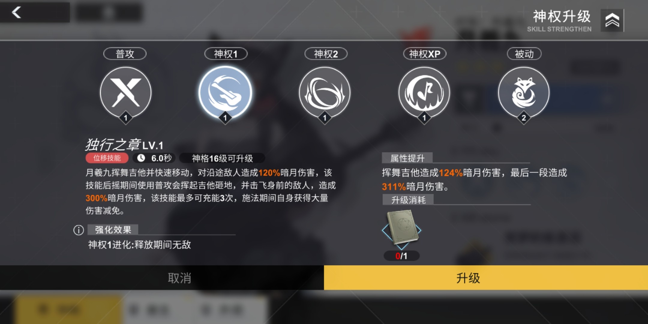 月曦九挥舞吉他对目标造成暗月伤害,每段伤害提升30%伤害,最后一段会击飞所有敌人。