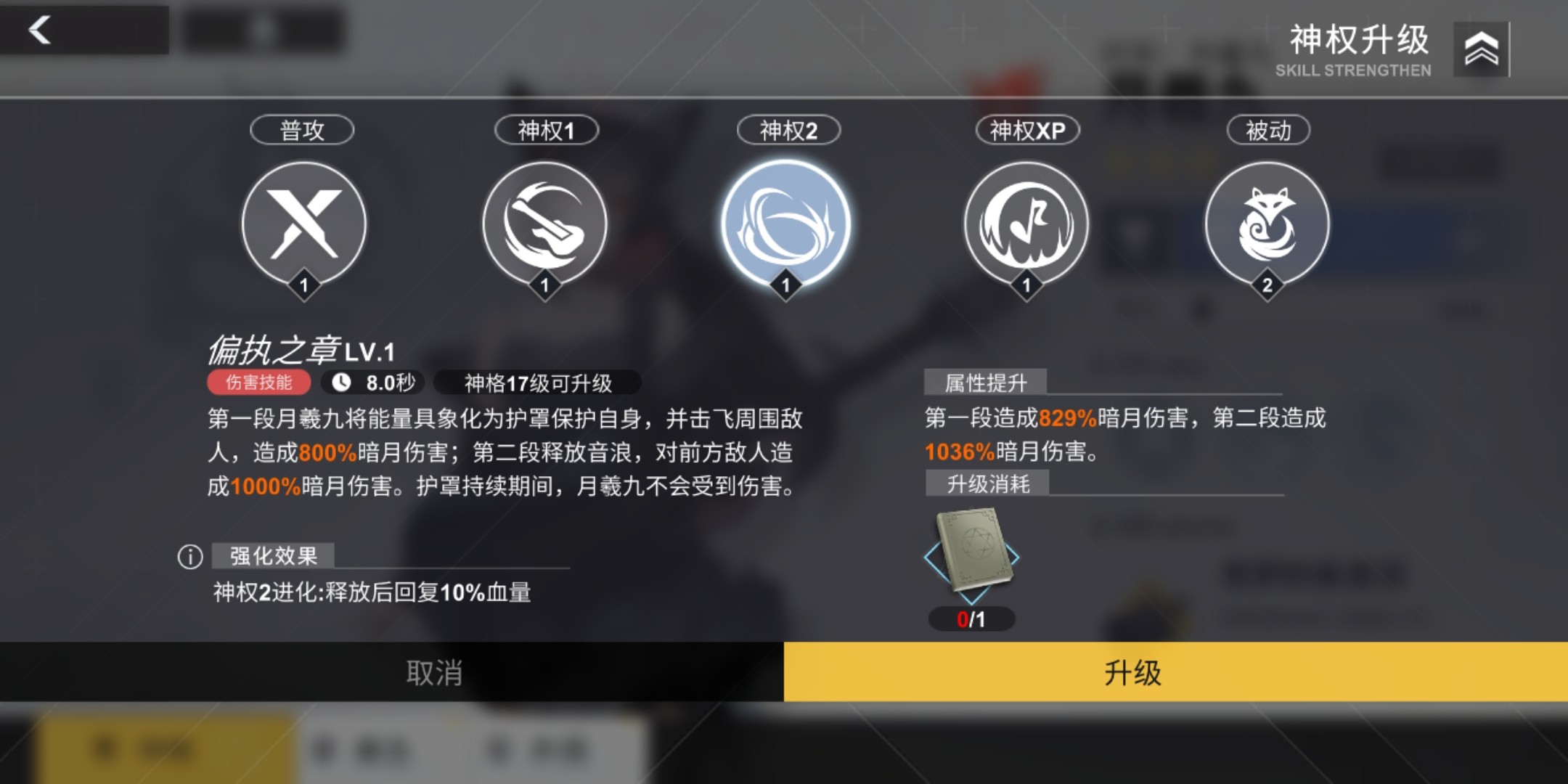 第二段释放音浪,对前方敌人造成1000%+暗月伤害并造成击退进化效果:释放后回复10%的血量。