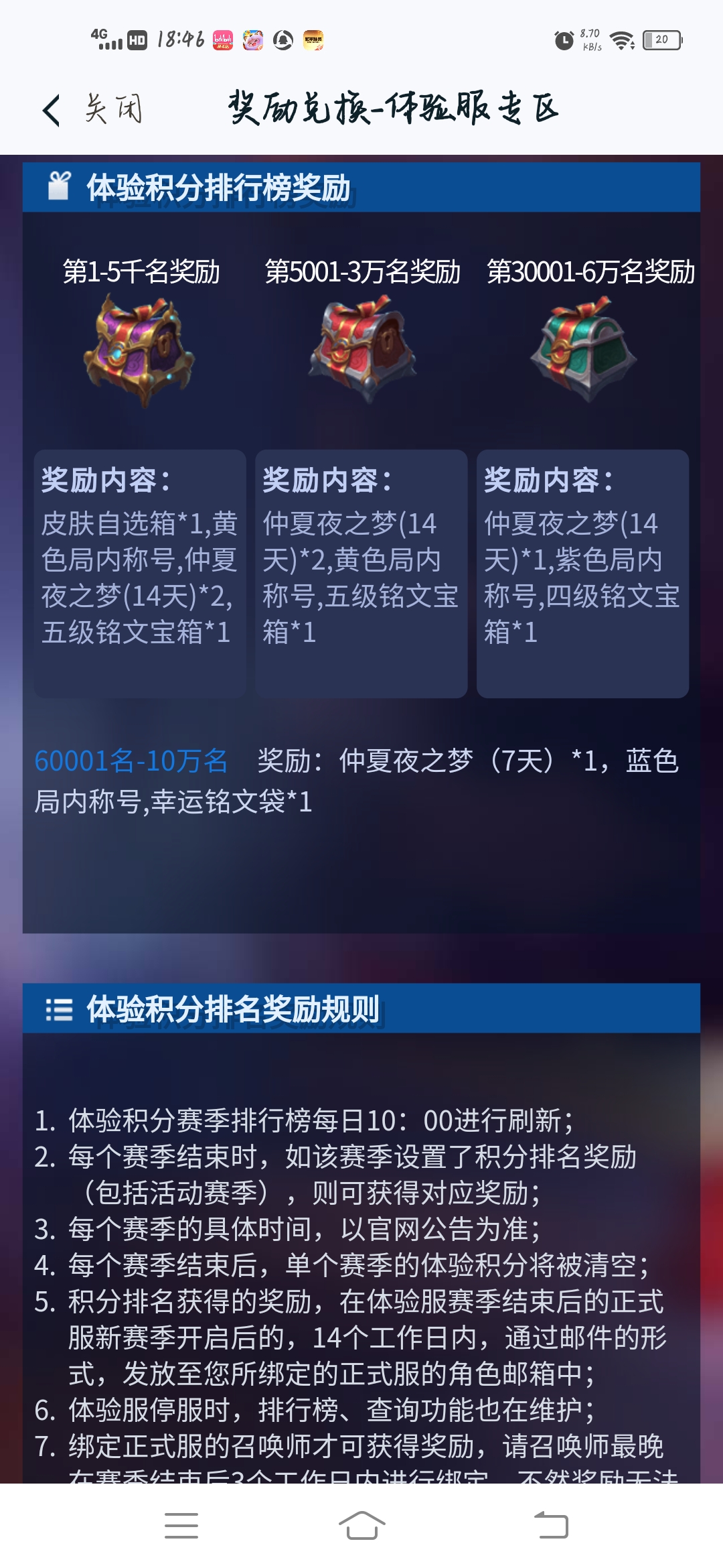 申请完体验服之后我们不仅可以体验王者最新的版本以及英雄,以及各种更新公告,我们都是可以知道的,而且去打体验服的排位的话会有那个体验积分,这里有这个排名然后你打这个的话你可以得到不少奖励的,这个现在奖励比较少,之前我记得都有永久皮肤的,不过也将就可以用,而且我们都可以用得到的体验币去换皮肤碎片,每天换一次,铭文没满的也可以拿来换铭文,还可以换点小钻石