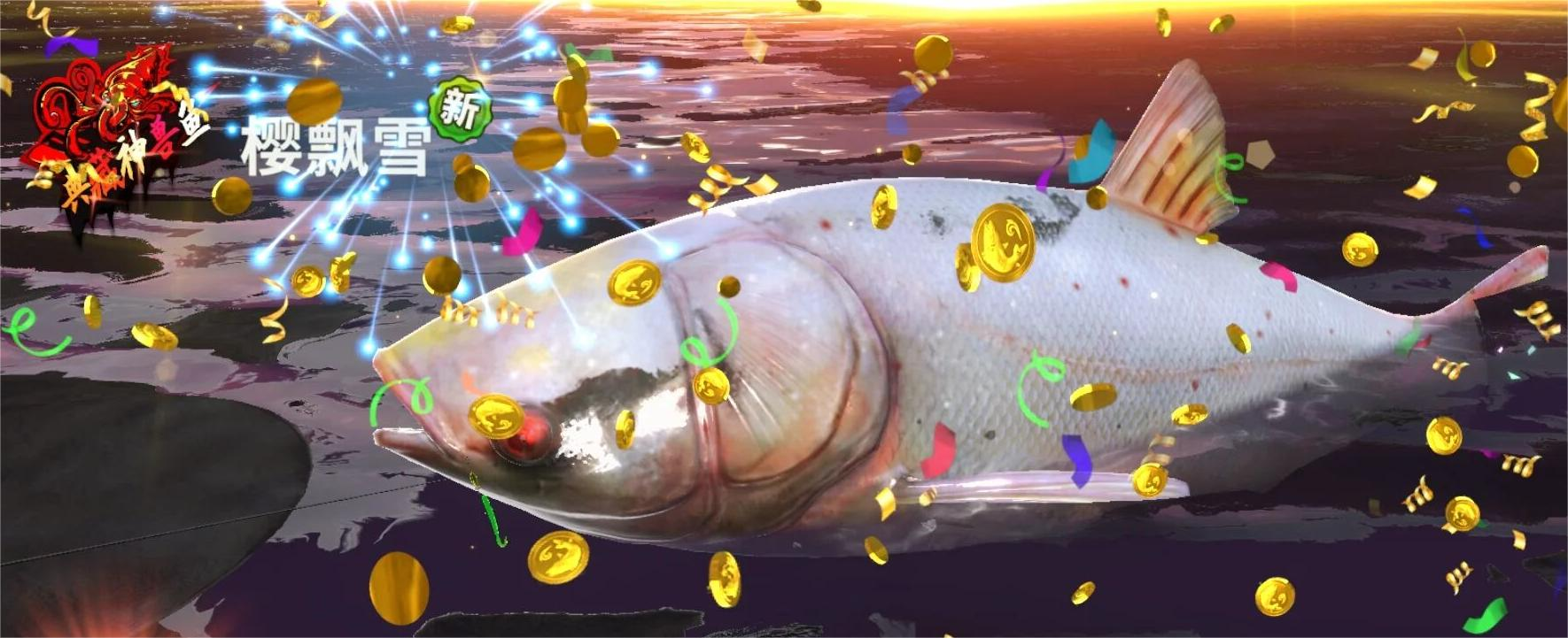 在垂钓到鱼骨后,触发了带有樱飘雪图标的湖中巨物。第一条鱼和第二条大鱼上钩后,不收杆,继续耗着,静等第三条鱼。使劲拉线,注意避免断线,经过几回的拉扯,把樱飘雪吸引出来,最后进行爆气收杆。