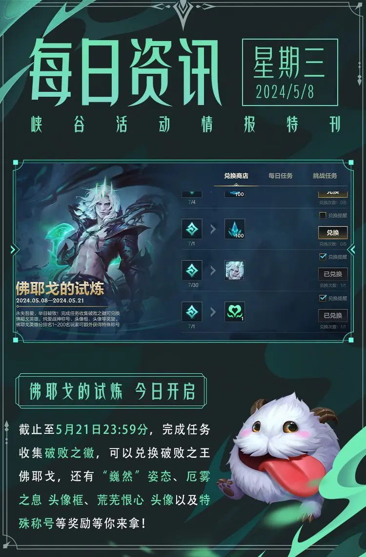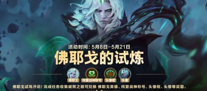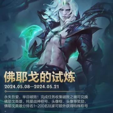 佛耶戈的试炼今日开启!永失吾爱,举目破败,截止至5月21日23:59分,完成任务收集破败之徽,可以兑换破败之王 佛耶戈,还有“巍然”姿态、厄雾之息 头像框、荒芜恨心 头像以及特殊称号等奖励等你来拿!
