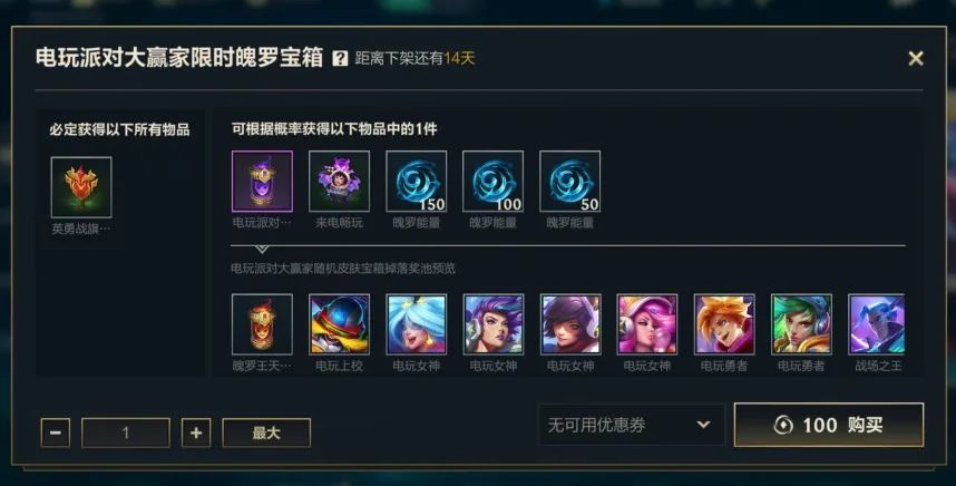 电玩派对大赢家限时魄罗宝箱也在同步热卖中!截止至5月21日23:59分,使用100点券开启宝箱,即可获得金牛战旗 英勇战旗(1天),还有机会获得电玩派对大赢家随机皮肤宝箱、来电畅玩 英勇战旗以及魄罗能量等好礼~