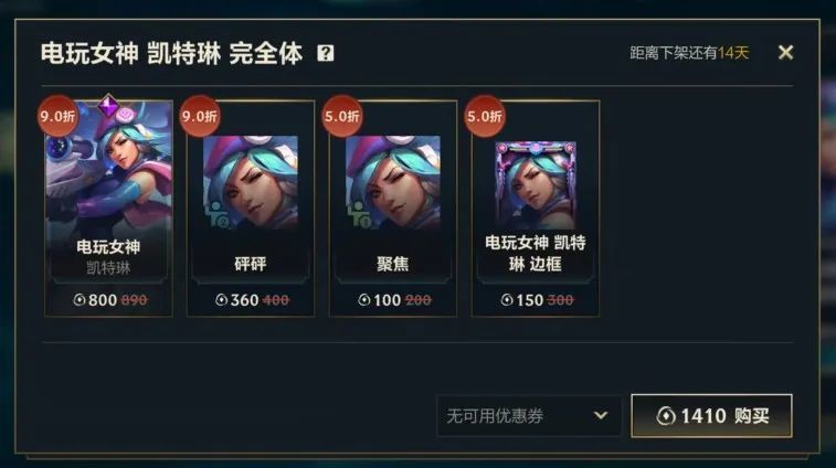 不仅如此,即日起至5月21日23:59分,召唤师还可以1410点券的价格购入电玩女神 凯特琳 完全体礼包,礼包内包含9折优惠的电玩女神 凯特琳皮肤和“砰砰”姿态,更有5折优惠的“聚焦”姿态和边框!