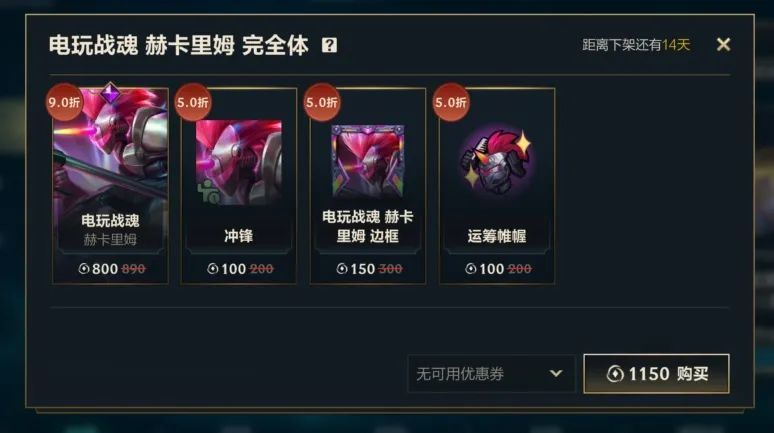即日起至5月21日23:59分,召唤师只需以1150点券的优惠价格即可购入电玩战魂 赫卡里姆 完全体礼包,礼包内包含9折优惠的电玩战魂 赫卡里姆皮肤,更有5折优惠的“冲锋”姿态、运筹帷幄 局内表情以及边框~