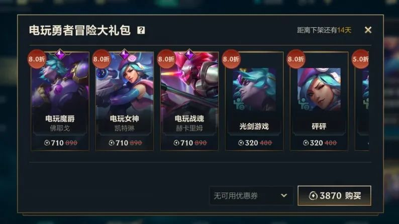 截止至5月21日23:59分,召唤师们可前往商城,使用3870点券获取电玩勇者冒险大礼包,礼包内包含8折优惠的电玩魔爵 佛耶戈、电玩女神 凯特琳、电玩战魂 赫卡里姆3款电玩系列皮肤,还包含对应英雄姿态、头像框以及运筹帷幄 局内表情、霓光绚影 回城特效等5折好礼~
