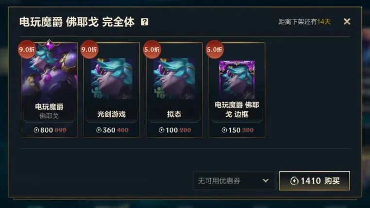 电玩魔爵 佛耶戈 完全体礼包也在限时优惠出售中!即日起至5月21日23:59分,召唤师可以使用1410点券购入完全体礼包,礼包内包含9折优惠的电玩魔爵 佛耶戈皮肤和“光剑游戏”姿态,更有5折优惠的“拟态”姿态以及边框!