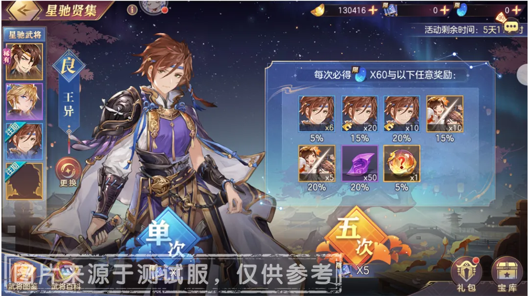 小将军们每次招募,必当额外获得「英杰宝珠」*60,在活动宝库中可兑换「吕玲绮碎片」、「法正碎片」、「无双觉醒石」、「随机神将将魂」等奖励。