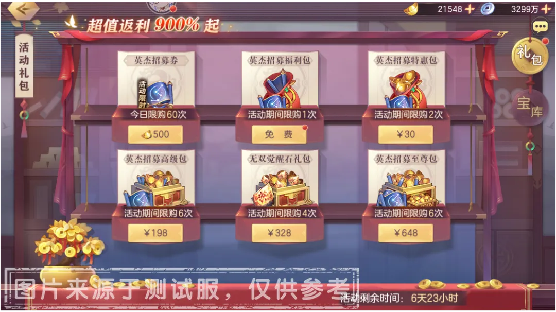 英杰招募至尊包:内含英杰招募券*60、元宝*6480,售价648元,活动期间限购6次。
