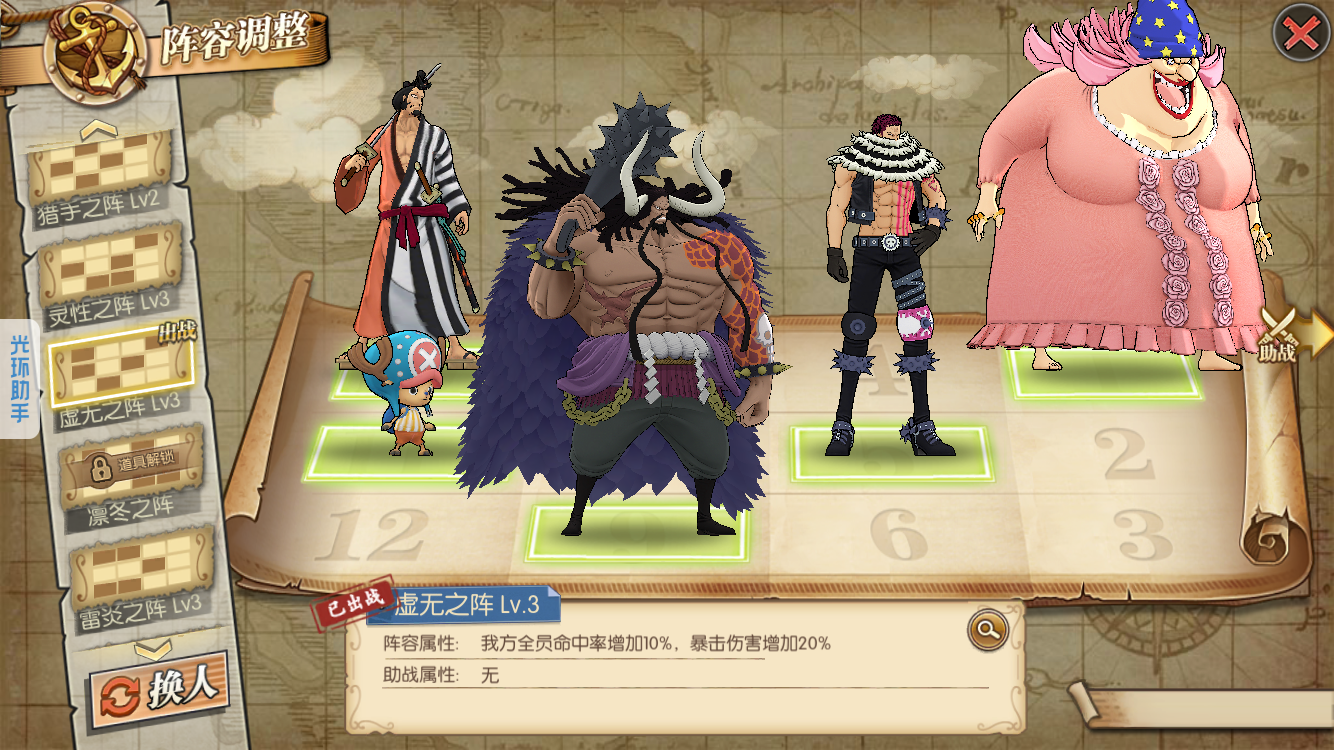①:人物全上高输出的人物,正常输出即可。本次的主线难度不打,不过考究大家对人物的培养度,以及阵容上的搭配,核心的乔巴回血、大妈的前排肉坦度,其次看大家的单体技能的伤害,可以说这只是德岛前期的篇章,人物boss的技能附加效果没有过多被动状态,容易让大家通过。尤其单体boss较多,大家若培养了锦卫门,通关的时间于难度能快。