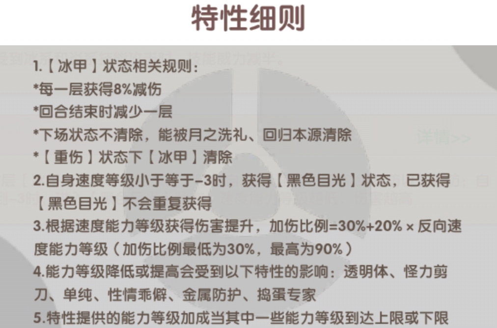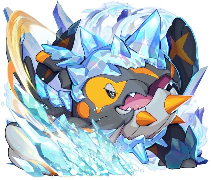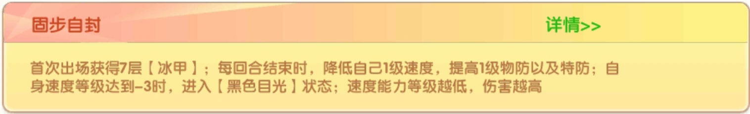 ·首次出场获得7层[冰甲];每回合结束时,降低自己1级速度,提高1级物防以及特防;自身速度等级达到-3时,进入[黑色目光]状态;速度能力等级越低,伤害越高