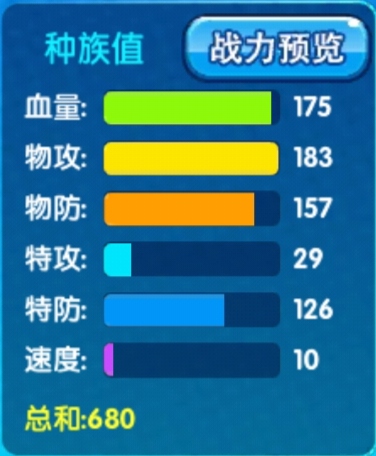 种族值分析:血量175,物攻183,速度10。种族值方面来看浩大鲸属于慢速型高攻宝可梦,防御极高,加上特性带来的56%的减伤,抗伤方面是可以的。
