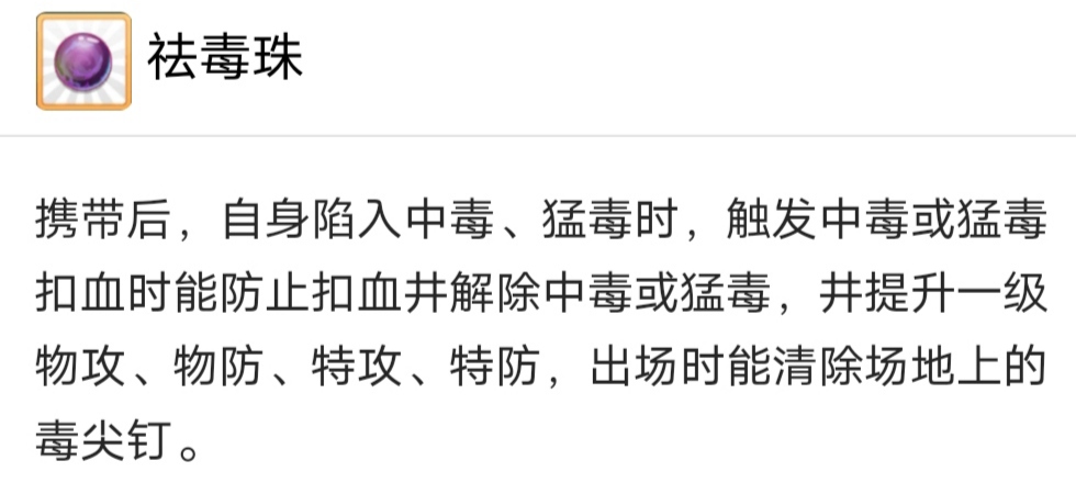 祛毒珠可以防超坏星这种用毒的宝可梦,自身陷入中毒、猛毒时,解除中毒和猛毒状态,并提升1级物攻,物防,特攻,特防,出场时能清除地上的毒尖钉。