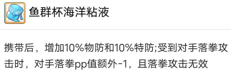 鱼群杯海洋粘液可以为浩大鲸提升10%的物防和10%的特防;同时可以免疫落拳带来的效果,可以为队伍防治那些辅助型宝可梦。