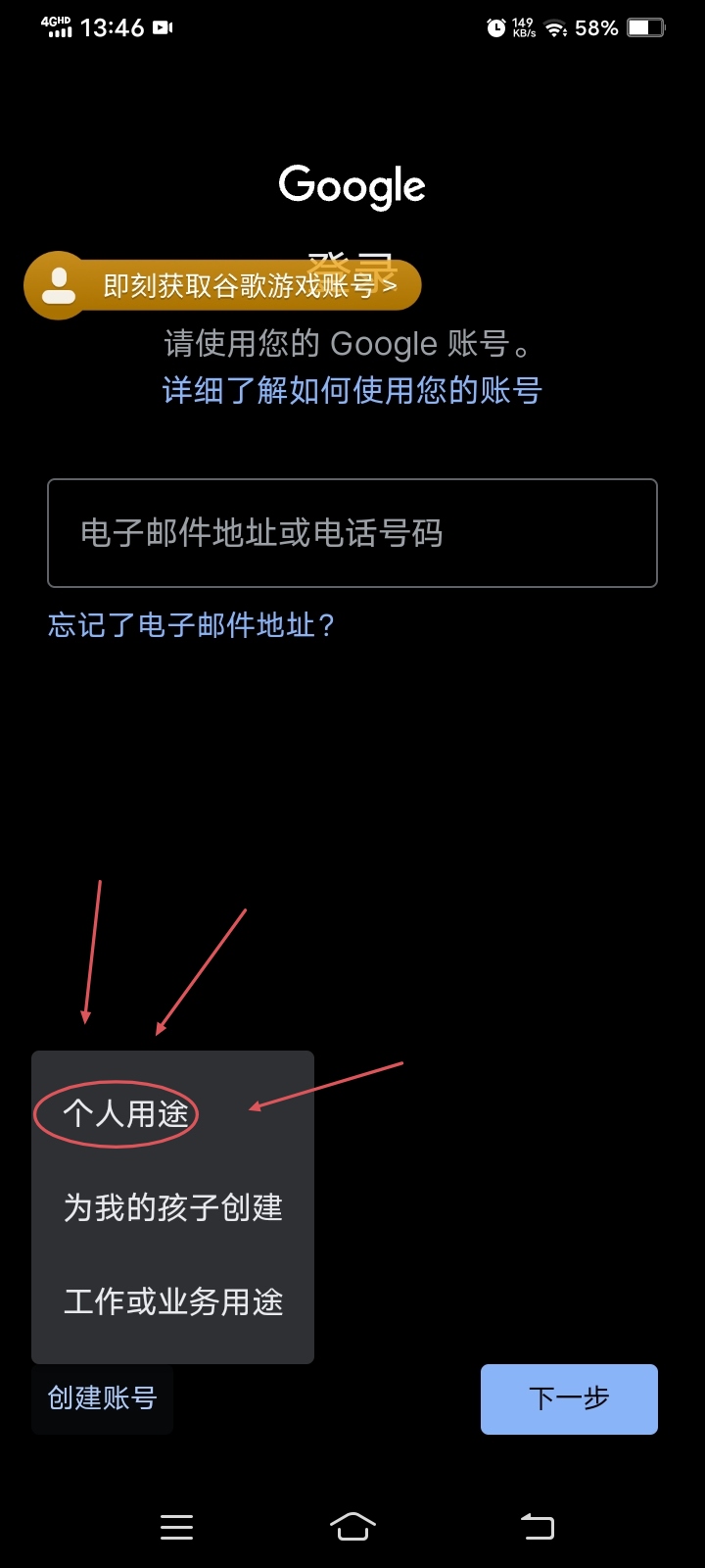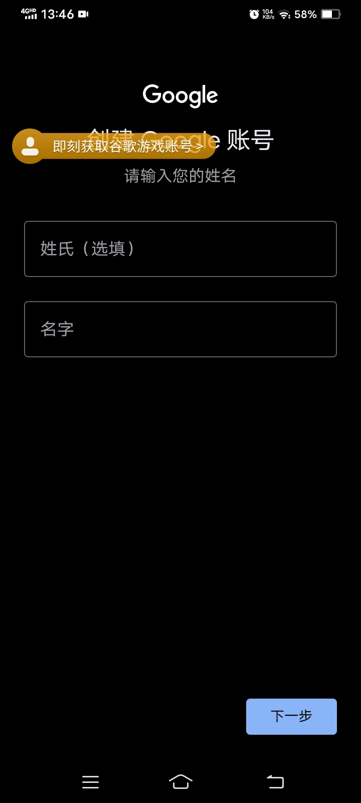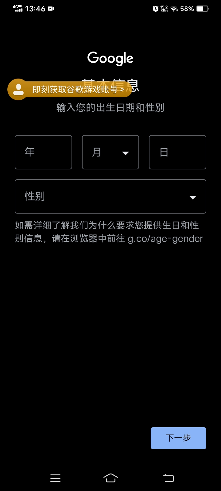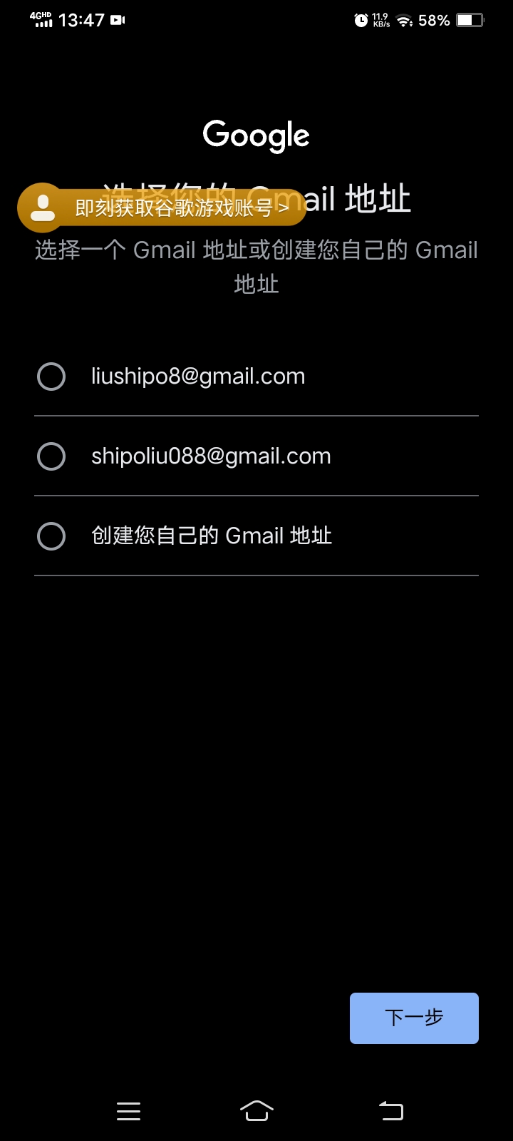 4.开始创建谷歌游戏账号(如果有的话就登入自己的账号可以自行跳过这步)