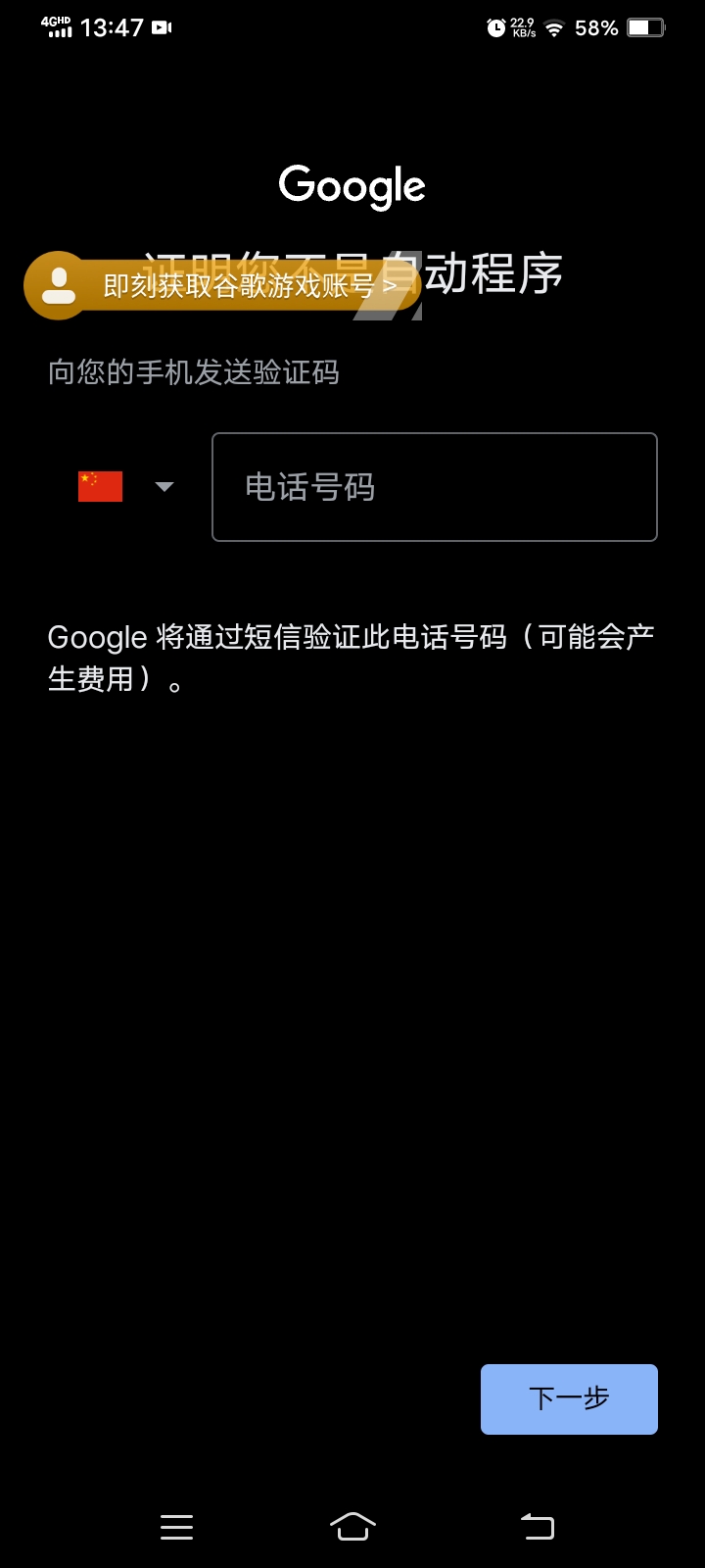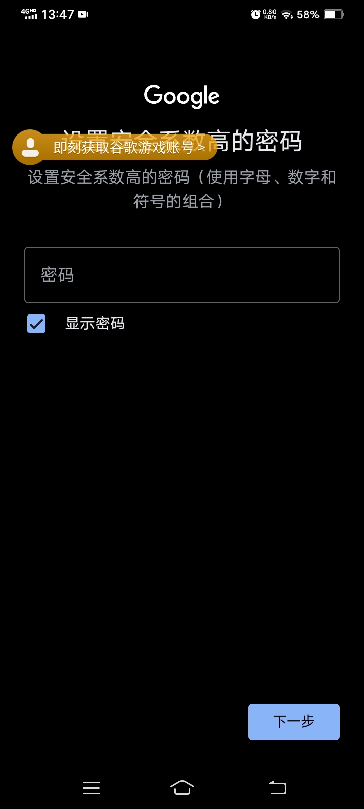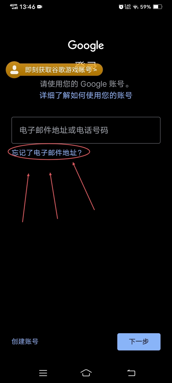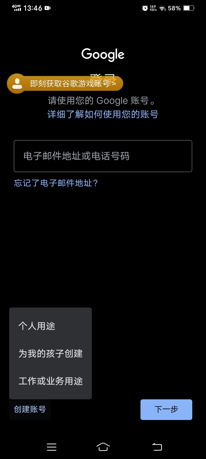 4.开始创建谷歌游戏账号(如果有的话就登入自己的账号可以自行跳过这步)