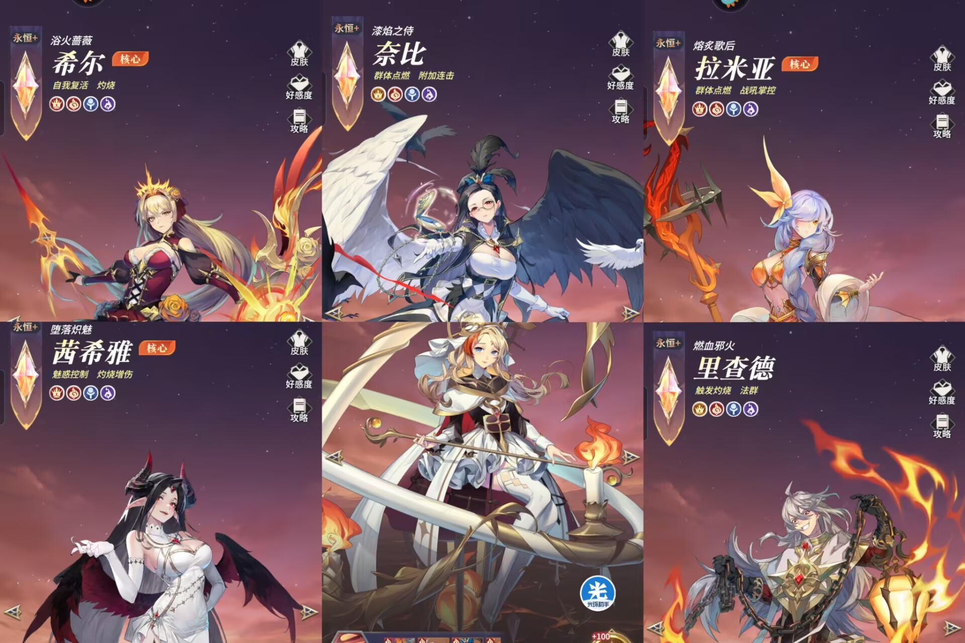 最后搭配希雅补伤害,希雅的群体法伤灼烧也是非常猛的,也可以帮队伍叠火。