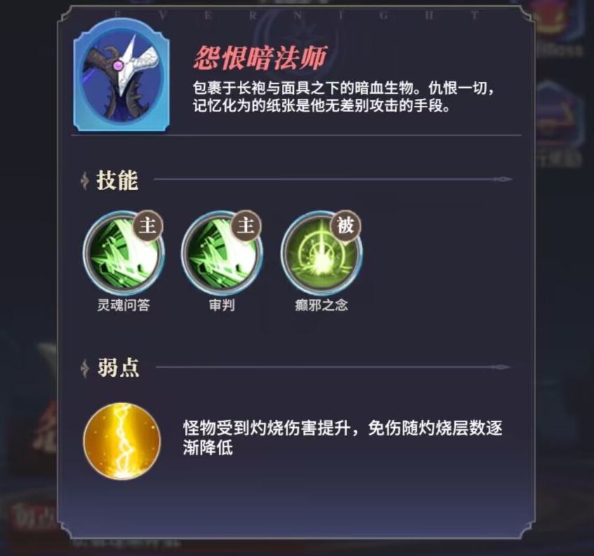 二:【怨恨暗法师】弱点。怪物受到灼烧伤害会大幅度提升,然后灼烧可以降低首领的免伤,让我方输出最大化。