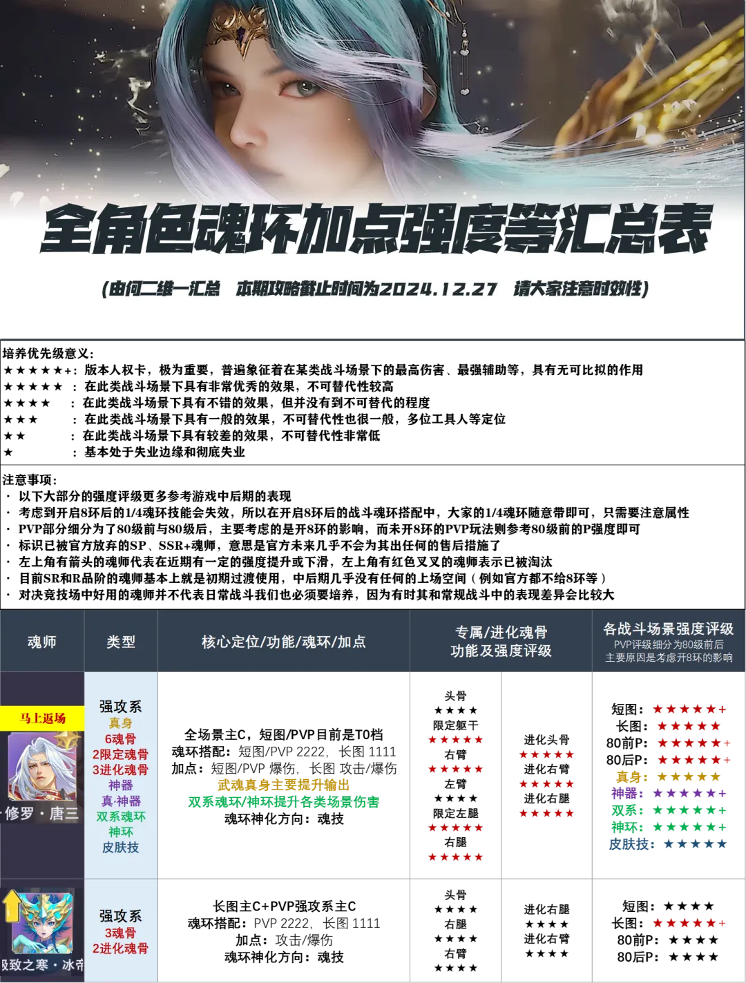 今天的攻略到了咱们该更新一番全魂师加点/魂环/强度/功能等内容的一图流汇总攻略的时间了,上一期汇总的时间是在10月份,目前时隔两个月之后,游戏的大环境也是出现了翻天覆地般的变化,不管是在魂师端还是阵容端,众多新魂师和新资源的上线也给游戏带来了不小的革新之气,所以也希望今天的这份全魂师培养一图流攻略能给大家带来一些小小的帮助和欢乐,哈哈。
