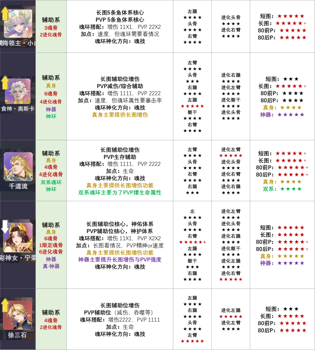 接着是防辅系部分,在这两个月官方一共是上线了两位防辅系魂师,SP小白和SSR+徐三石,那么由于这两位魂师的品阶有较大的差距,所以其综合强度在当前版本也是各有千秋,例如SP小白在长图中已经展现出了替代SP宁荣荣的大能,这点对于魂师对决的长图阵容也起到了巨大的变革作用,外加源魂心这个东东的加成......SP宁荣荣在长图中彻底步下神坛也只是个时间问题了,此外SP小白在短图中也有非常亮眼的发挥,但在PVP中她的表现还是要略逊SP宁荣荣一筹的,这点大家可以参考。