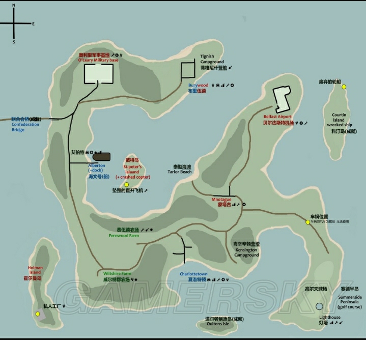 分别位于西南,东北角的两座岛,其中霍尔曼岛上有一个类似于避难所(地图上标记为私人工厂)的建筑,科汀岛上有一艘搁浅的轮船,物资参考蒙塔古