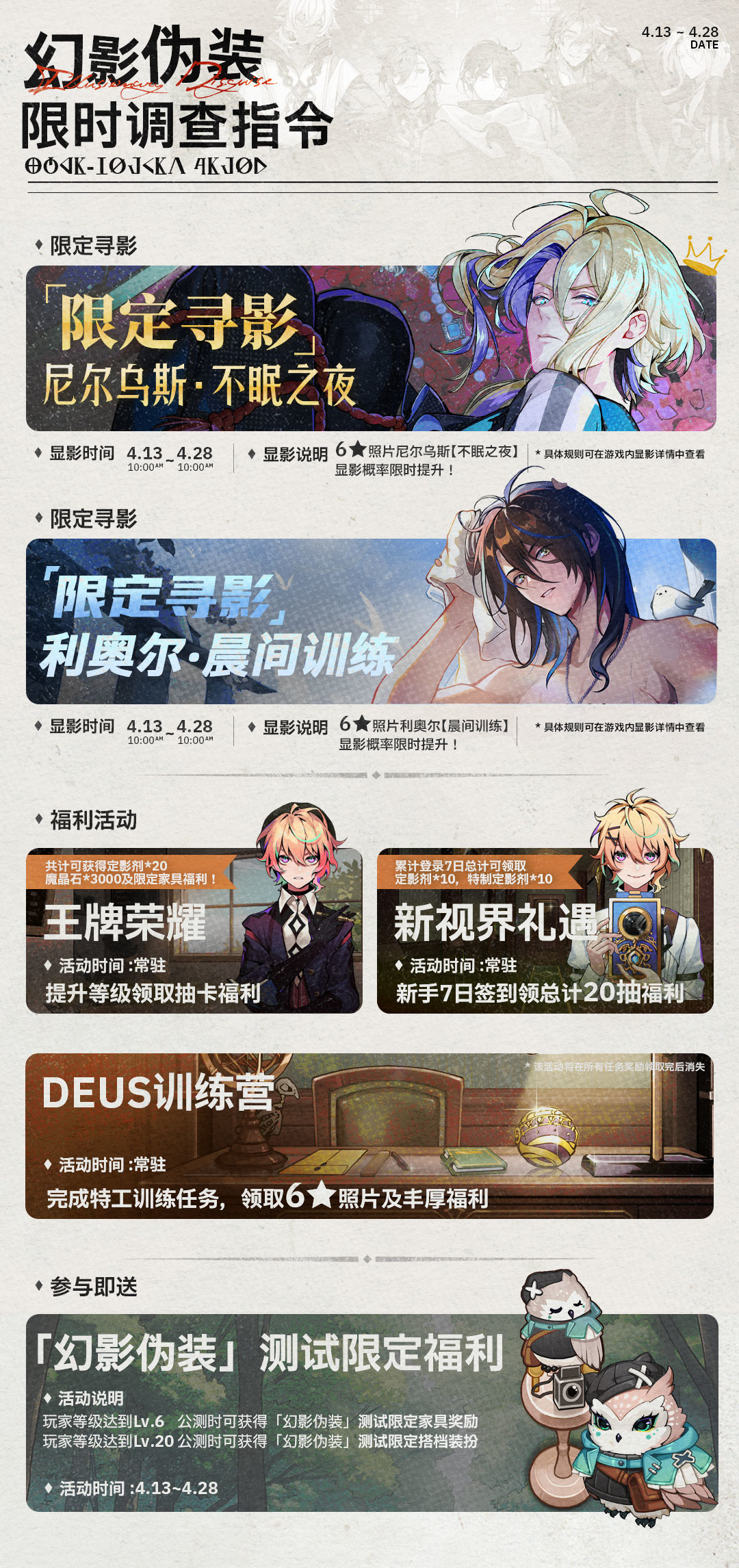 亲爱的特工,「幻影伪装」行动将于明天(4月13日)正式启动,我们为新手特工整理了本次测试期间的精彩活动情报。希望能对您有所帮助。