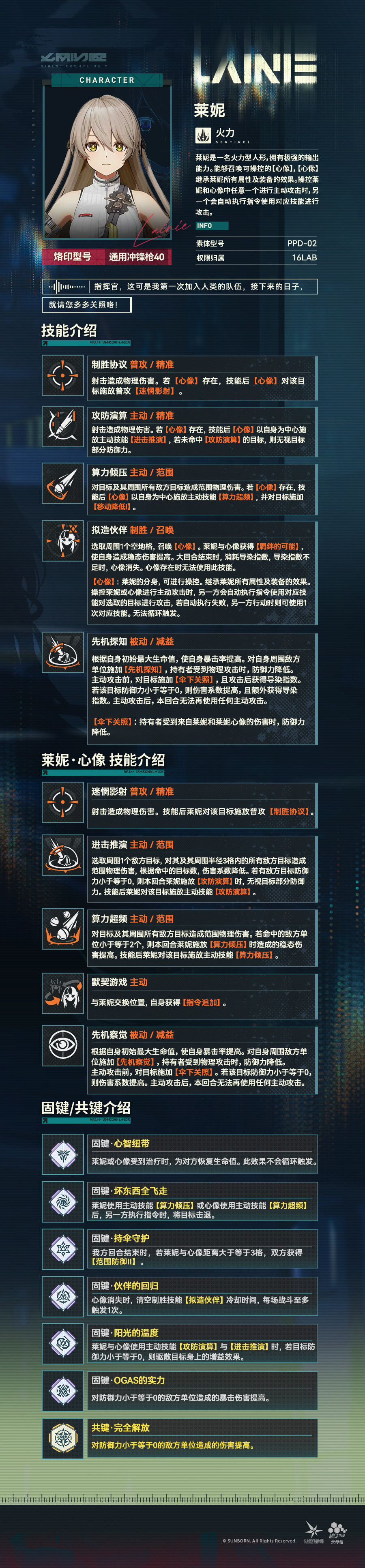 莱妮是一名火力型人形,拥有极强的输出能力。能够召唤可操控的【心像】,【心像】继承莱妮所有属性及装备的效果。操控莱妮和心像中任意一个进行主动攻击时,另一个会自动执行指令使用对应技能进行攻击。