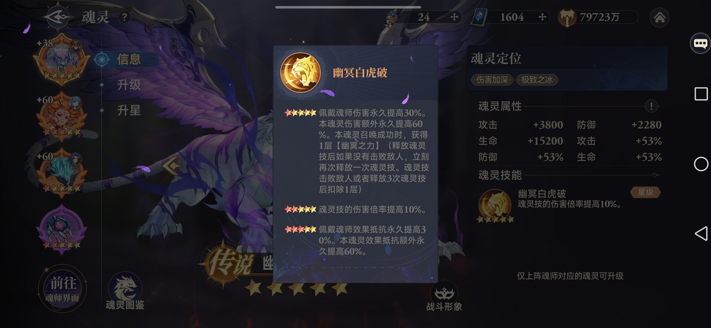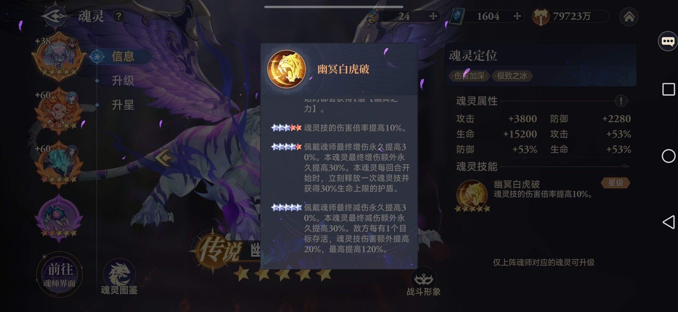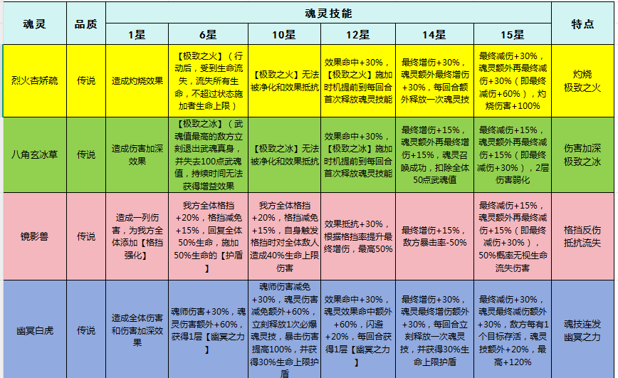 10星时,立刻释放一次必爆魂灵技;14星时每回合立刻释放一次魂灵技;高星级后“幽冥白虎”输出能力更加强力,能够造成多段全体伤害。