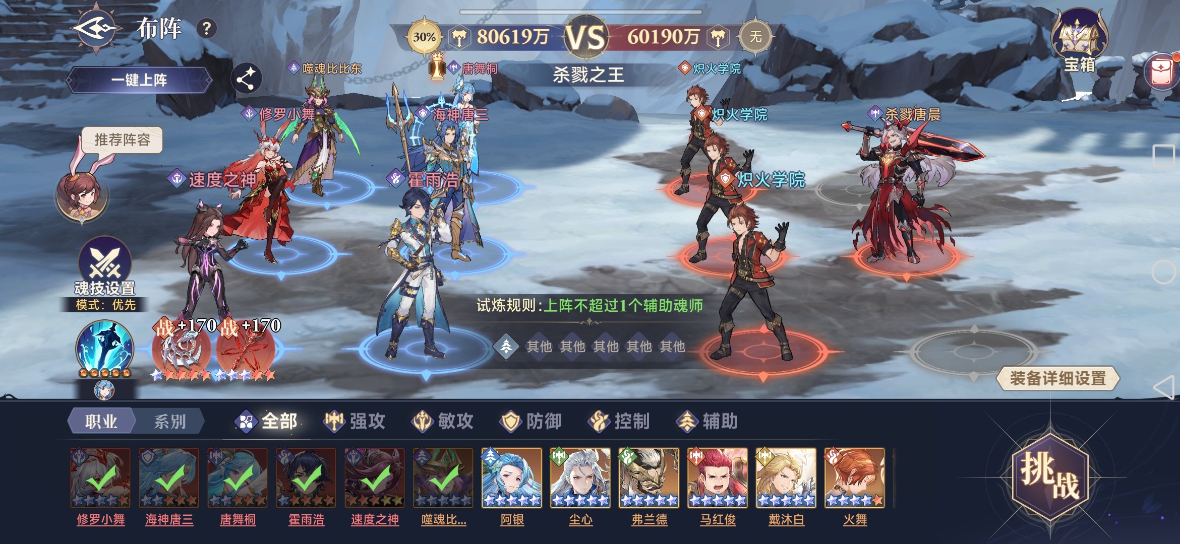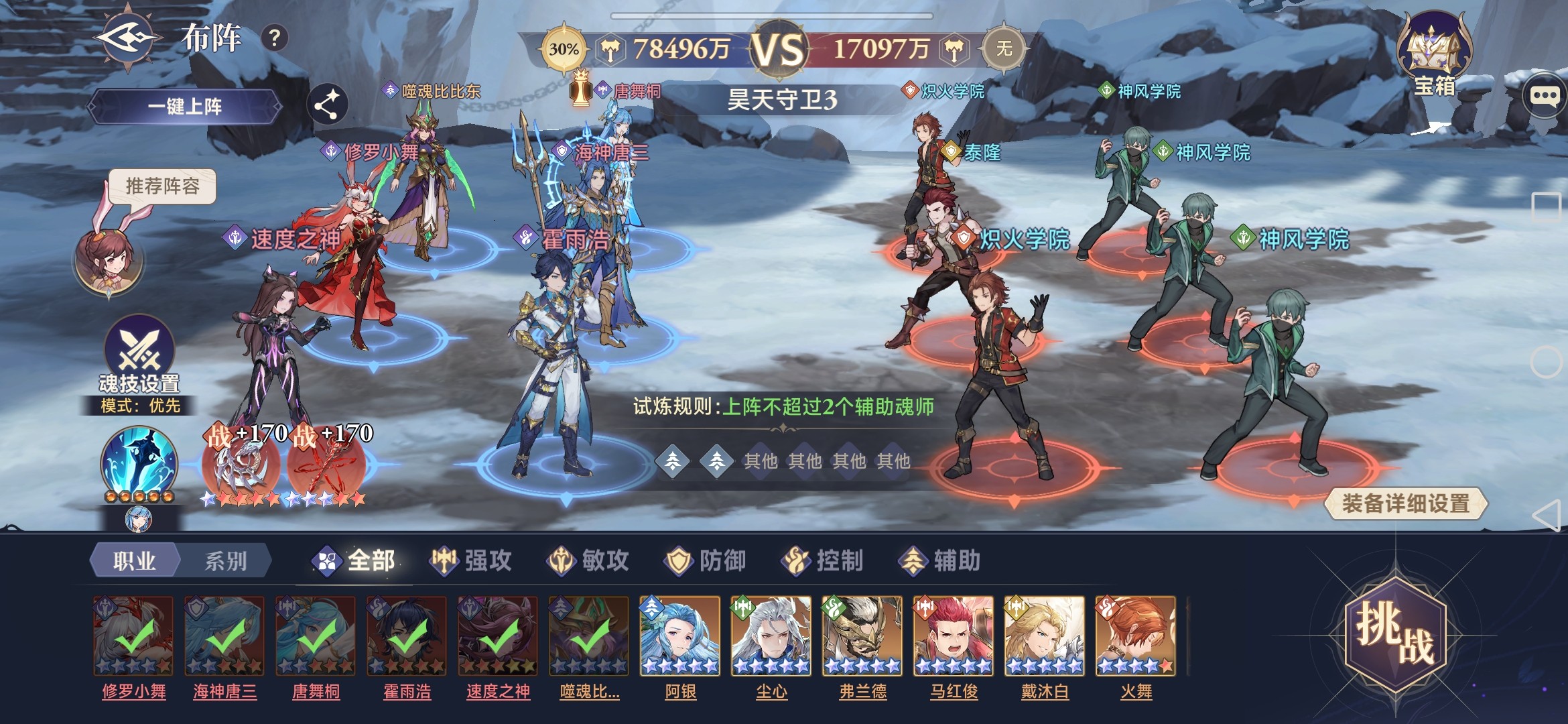 选择优先级:上阵2名防御魂师﹥上阵2名强攻魂师﹥上阵2名控制魂师。