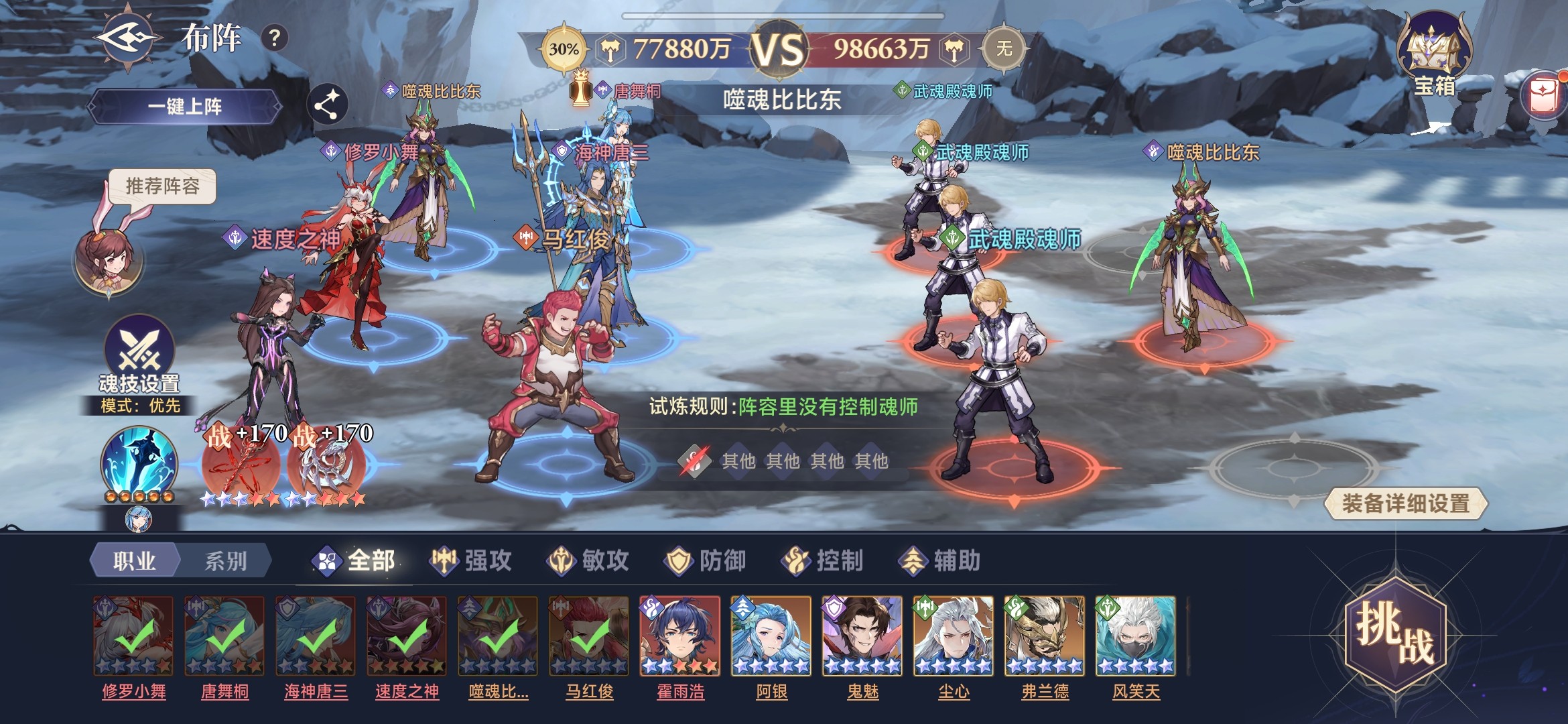 ※为了更好满星通关,建议多刷新几次,选择与玩家最强队伍相匹配的试炼规则,特别是确保唐舞桐、速度之神、霍雨浩、海神唐三、修罗小舞这些神话魂师能够上场,这样才能事半功倍、快速完成任务。