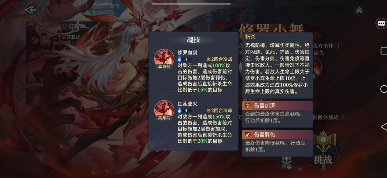 2.修罗小舞:①普攻,真身前对敌方造成70%攻击的伤害;真身后对敌方一列造成100%攻击的伤害,施加2层抗暴弱化,直接斩杀生命低于15%的目标。②魂技,真身前对敌方一列造成100%攻击的伤害,施加2层伤害弱化,直接斩杀生命低于15%的目标;真身后对敌方一列造成150%攻击的伤害,施加2层伤害加深,直接斩杀生命低于20%的目标。③被动,武魂真身状态下,触发1次追加攻击,有5%概率无视生命比例斩杀目标。