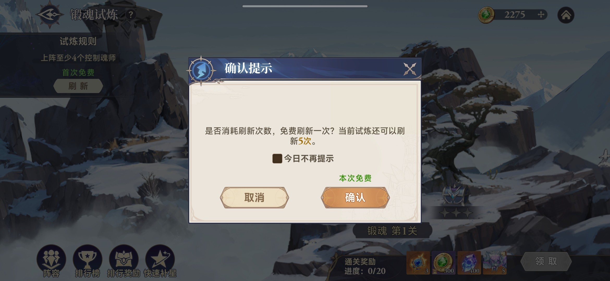 试炼规则有上阵2名防御魂师、2名敏攻魂师、4名控制魂师等10多种限制条件,该规则可以免费刷新1次,花费50魂晶不等进行付费刷新,最多可以刷新5次。