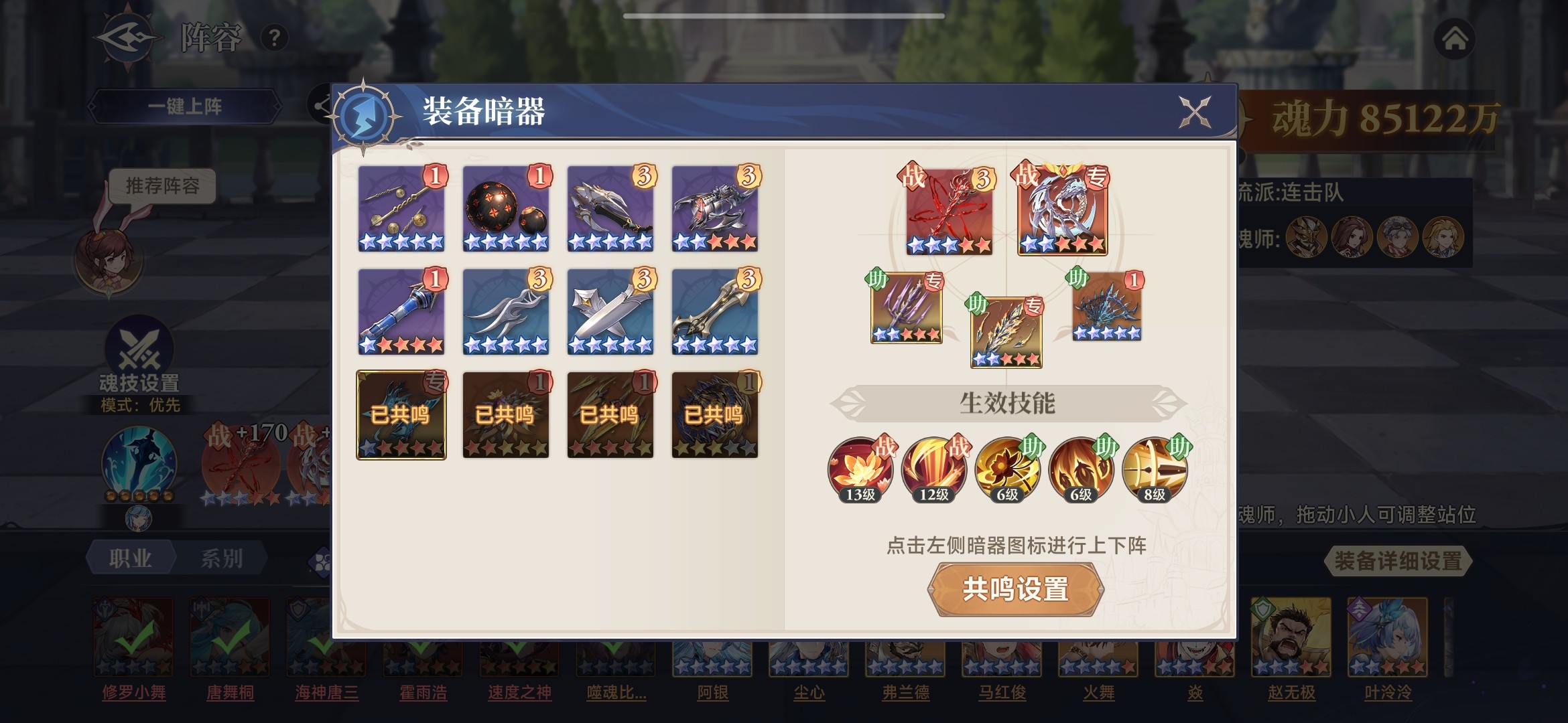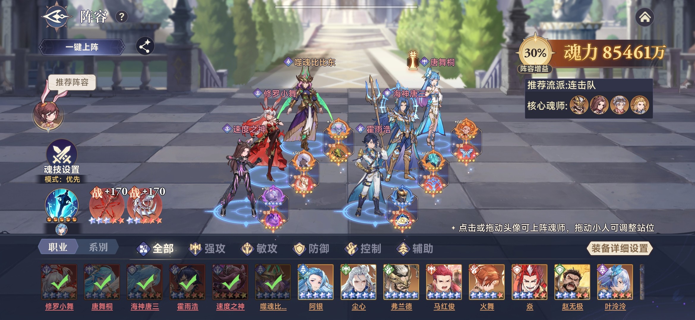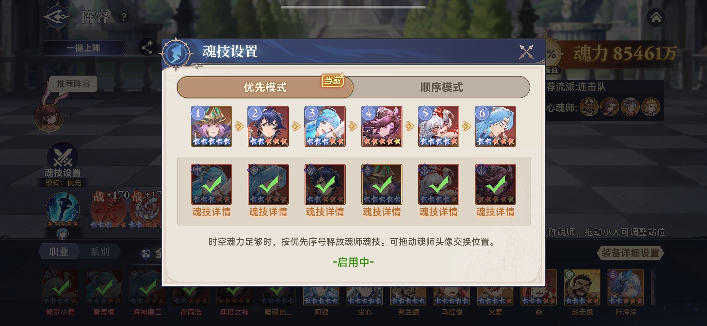 魂技释放顺序:采用优先模式,噬魂比比东、霍雨浩首次释放魂技无消耗,魂技前置;唐舞桐、速度之神、修罗小舞依次释放魂技,积攒状态极限输出;海神唐三最后释放魂技,增加队伍坦度。
