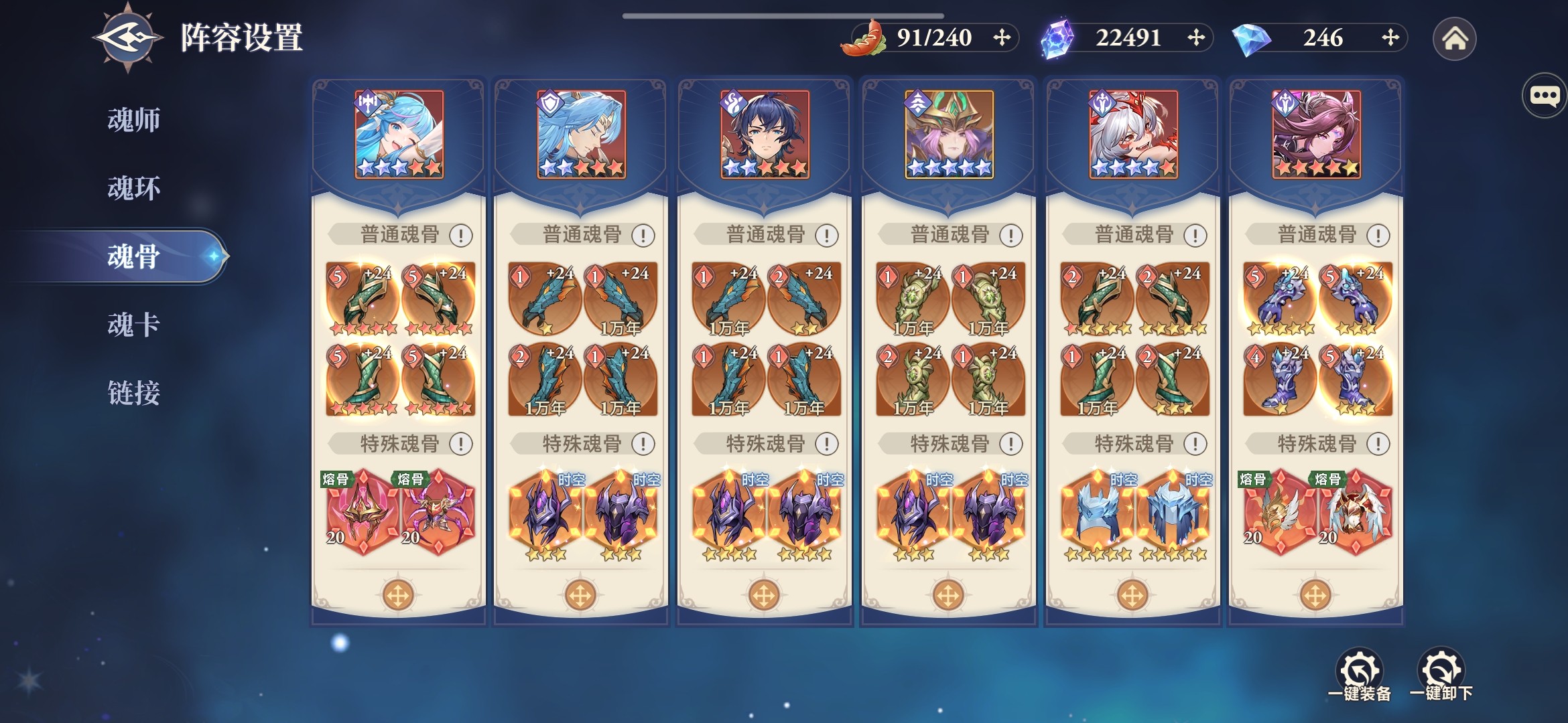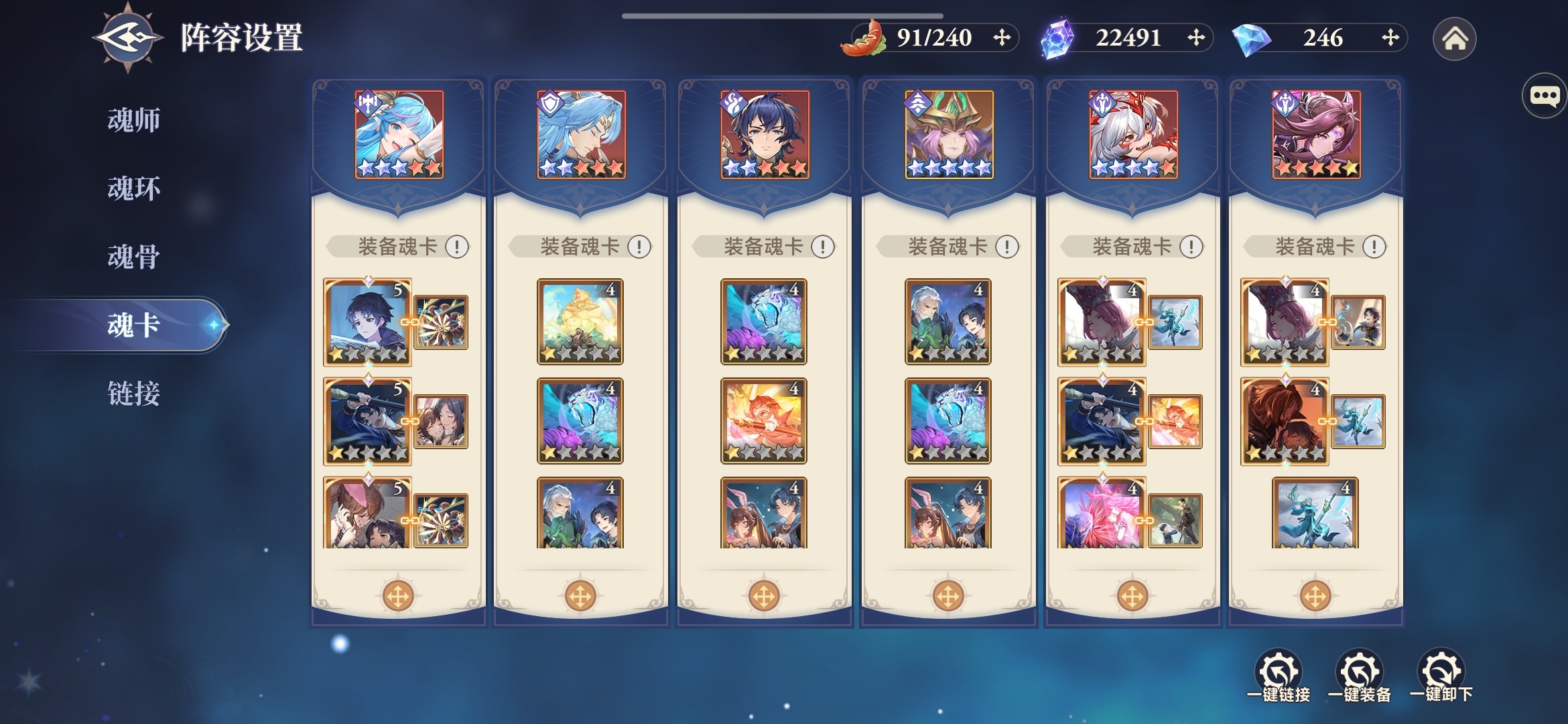 按照魂师特点,合理装配时空魂卡和普通魂卡。比如,速度之神(昊天初显、教皇冕下等)、唐舞桐和修罗小舞(小舞的叹惋等)、海神唐三、霍雨浩和噬魂比比东(父子的羁绊、第一魂环等)。如果没有时空魂卡,则搭配传说、史诗魂卡(黄金铁三角、幽冥白虎)。