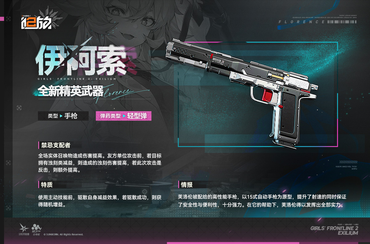 尊敬的指挥官,现在为您带来全新精英武器【伊阿索】情报!【伊阿索】手枪·轻型弹芙洛伦被配给的高性能手枪,以15式自动手枪为原型,提升了射速的同时保证了安全性与便利性,十分强力。在它的帮助下,芙洛伦得以发挥出全部实力。详情请看下图!