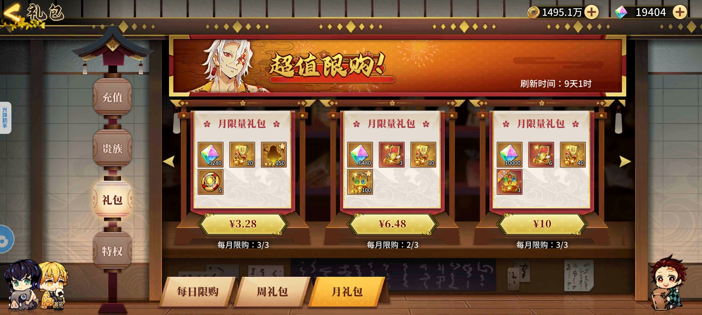 可见,目前只有垂云·无一郎、恋心·蜜璃、月彦·无惨。按照玩家喜好分为两方向,第一个强度档,第二爱好档。