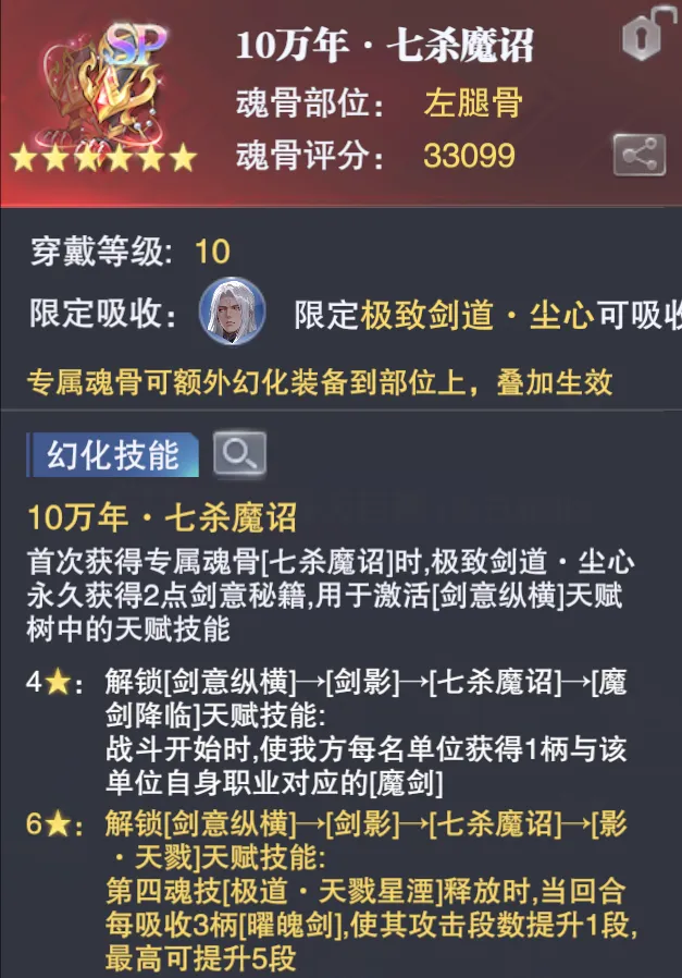 那么第一个首当其冲的因素便是SP+尘心的星级,而他的星级影响最大的便是SP+尘心天赋树的加点数量,其星级越高则我们可以在天赋树中点出的技能点也越多,当然这个加点的逻辑等下我们还会细说。按照官方的设计逻辑,SP+尘心未来的如魂骨等售后应该会大幅度的影响他天赋树的分支与加点数量,例如这一块专属魂骨和进化魂骨便已经充分说明了,没魂骨连打短图和快速PVP的先机效果都没有,而只有拿到这块魂骨才能激活打短图和快速PVP的能力,同时有没有魂骨还会大幅影响天赋树的加点数量,例如基础魂骨额外给2点,进化魂骨额外给3点天赋树加点也会大幅影响SP+尘心的强度上限,此外根据这两次魂骨上线时的操作,未来当有新的售后措施加入时SP+尘心还会新增天赋树的分支,这或许也是官方不断加强SP+尘心的一个重要思路。这点其实很多朋友都还处于个有点懵的状态......其实SP+尘心天赋树的加点和他的伤害会有巨大的关联,这里我们用长图SP+尘心的三种加点方式和三种方式所对应的伤害来做个举例大家就懂了。PS:案例中的SP+尘心星级为彩色2星,有专属魂骨但没有进化魂骨,此时的总加点数为16点,接着案例中所打的战斗场景为神墟悬赏的敏攻系多桩boss,天气为烈日,所采用的阵容为标准的长图三控两辅(两辅中有一个是对应生命位的暗器唐雅),测试号等级为99级,战力约1300亿,此外由于游戏的数值早已崩溃,以下案例的对比结果仅供大家参考。第一种加点方式是直接把第一排红色“剑影”给拉满,而下边的蓝色“剑花”和黄色“剑舞”则根本不理,那么这种加点方式的特点在于:- 不但激活了领域,且还激活了领域生成后的补“极”魔剑能力与对应补“极”魔剑后的增伤能力