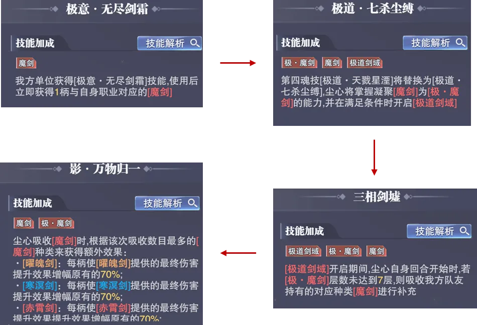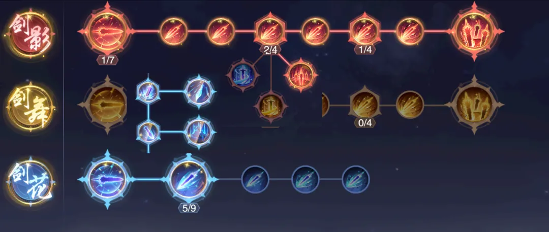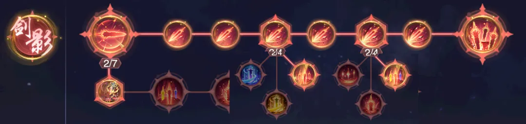 而这个点法最终的平均伤害约为10亿²⁶左右,比刚刚第一种点法的伤害基本上提升了100万倍左右。最后第三种加点方式是直接把第一排红色“剑影”给点到倒数第三个节点即可,而下边的蓝色“剑花”则按照上图所示,黄色剑舞则依然不理,那么这种加点方式的特点在于:- 激活了领域,同时激活了领域生成后的补“极”魔剑能力,但并没有激活补“极”魔剑后的增伤能力