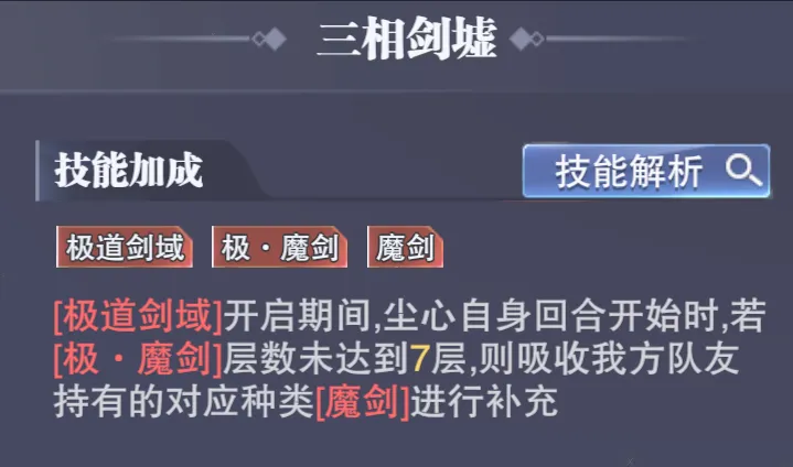 - SP+尘心想要打高伤害还需要看在他的“领域”持续时间里所吸收的“极”魔剑的数量,此时如果我们激活了上图中的这个【三相剑墟】效果,则我们便可以获得激活领域后的进一步补充“极”魔剑数量的能力,但如果没有点【三相剑墟】,则他激活领域时的“极”魔剑数量是多少,后续便是多少......甚至红色的“极”魔剑还会逐步减少,而在SP+尘心激活领域后的1技能输出上,当时拥有的“极”魔剑数量越多则伤害越高,且这个因素的影响也非常之大,这也是刚刚第三种加点方式为何伤害会高这么多的原因之一